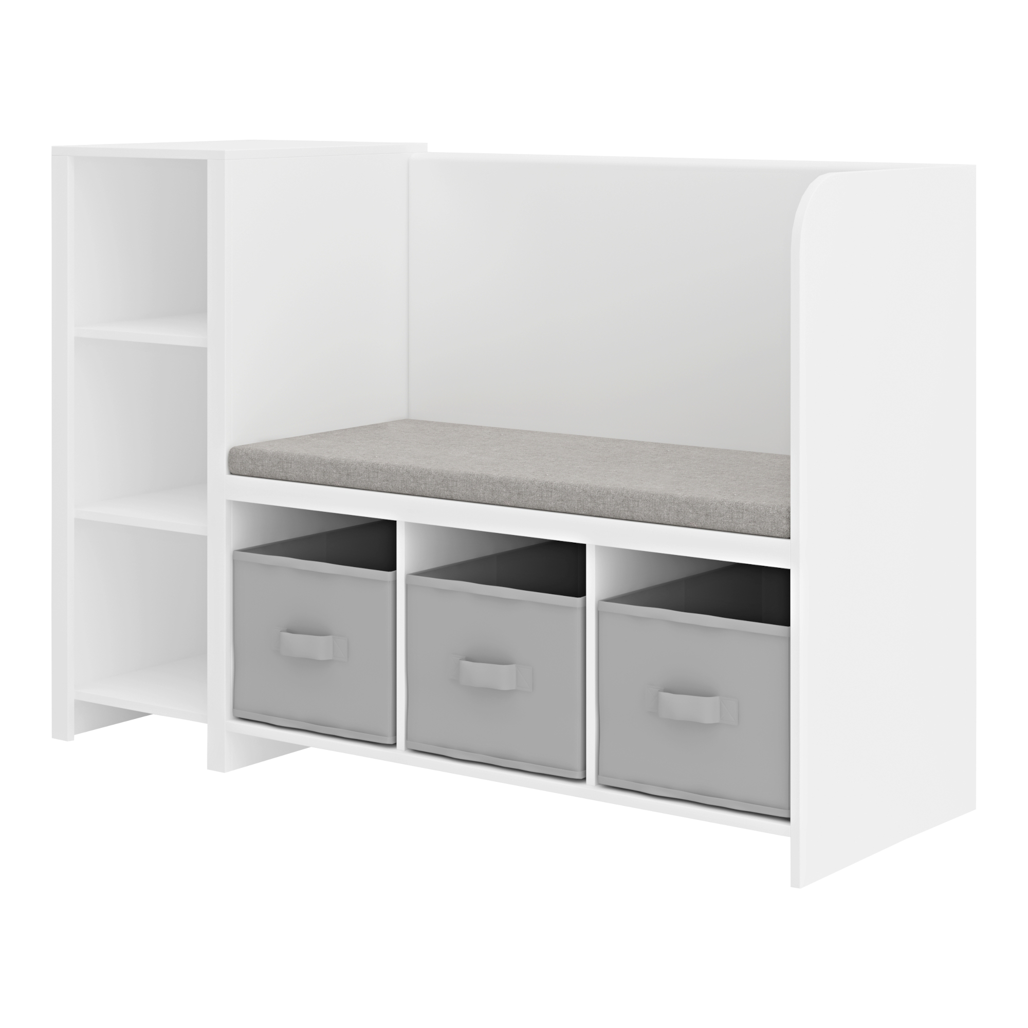 Die großzügige Sitzfläche ist mit einem behaglichen Polsterkissen ausgestattet, das für zusätzlichen Komfort sorgt. Unterhalb der Bank befinden sich drei geräumige Fächer mit herausnehmbaren Aufbewahrungsboxen, die für Spielzeug und andere Kleinigkeiten genutzt werden können.