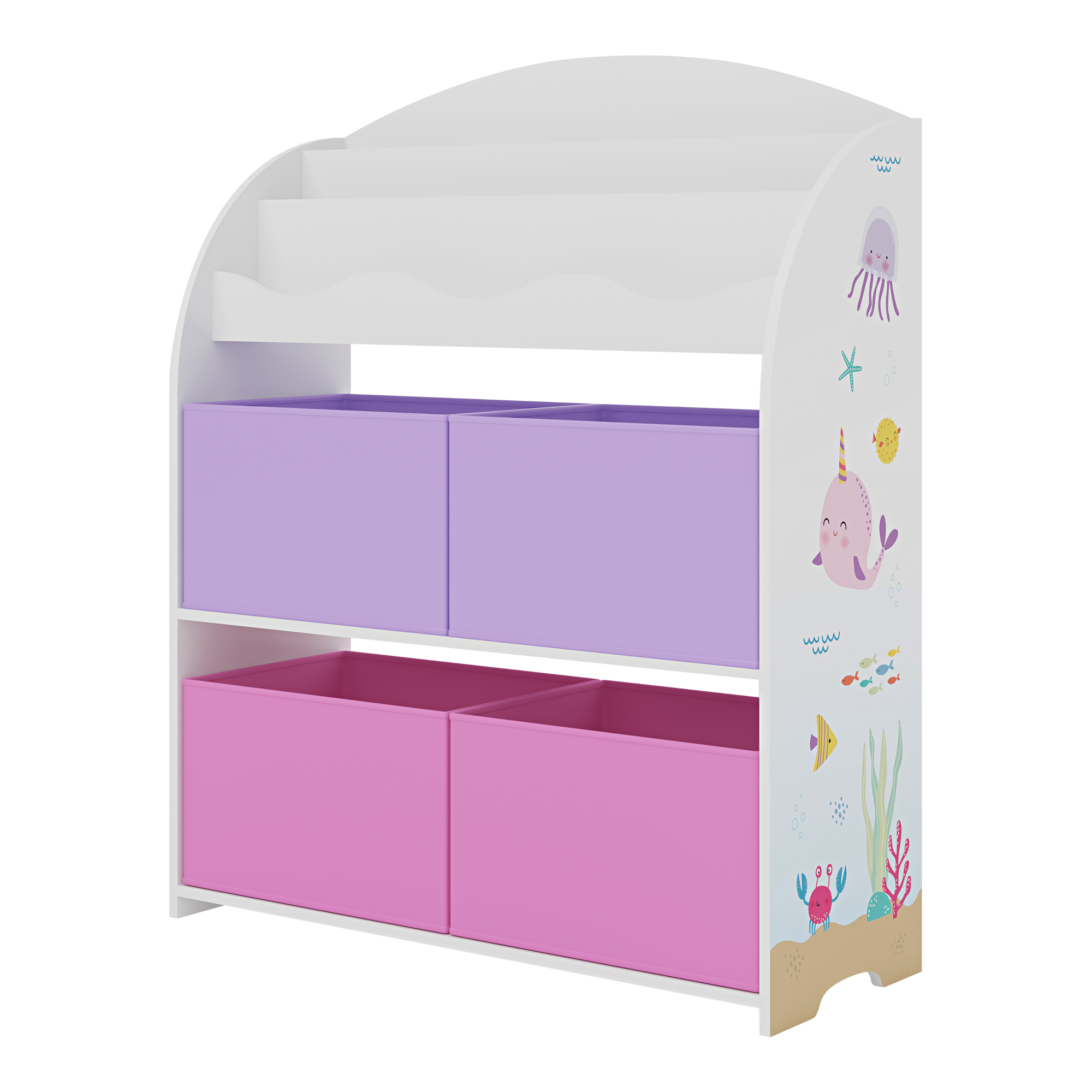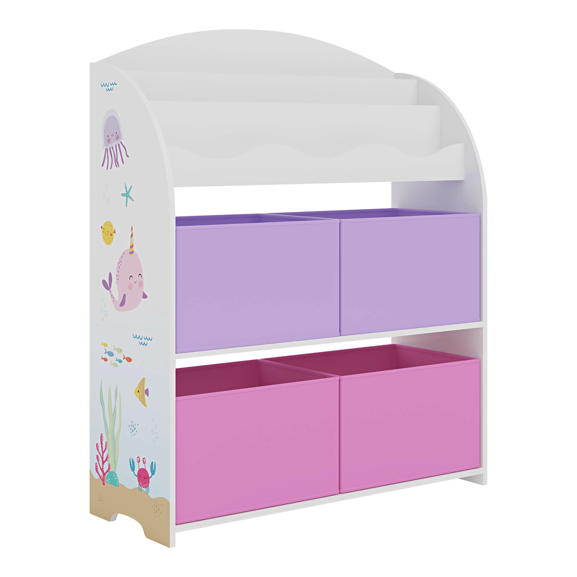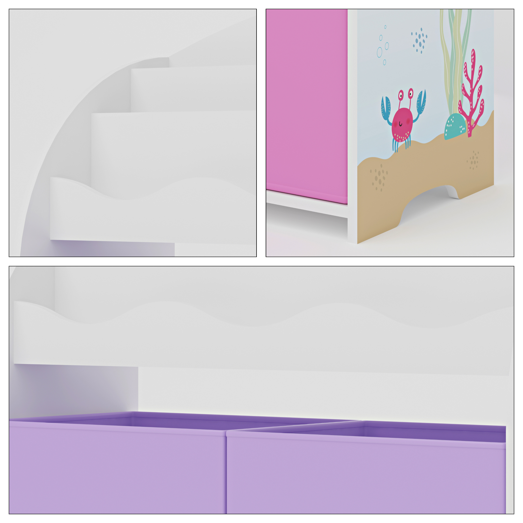 Das Kinderregal bietet mit seinen drei offenen Ablagefächern und vier unteren Aufbewahrungsboxen genügend Platz für die Schätze Ihres Kindes. Die verzierten Seitenwände und das ansprechende Motiv machen es zu einem echten Hingucker in jedem Kinderzimmer.