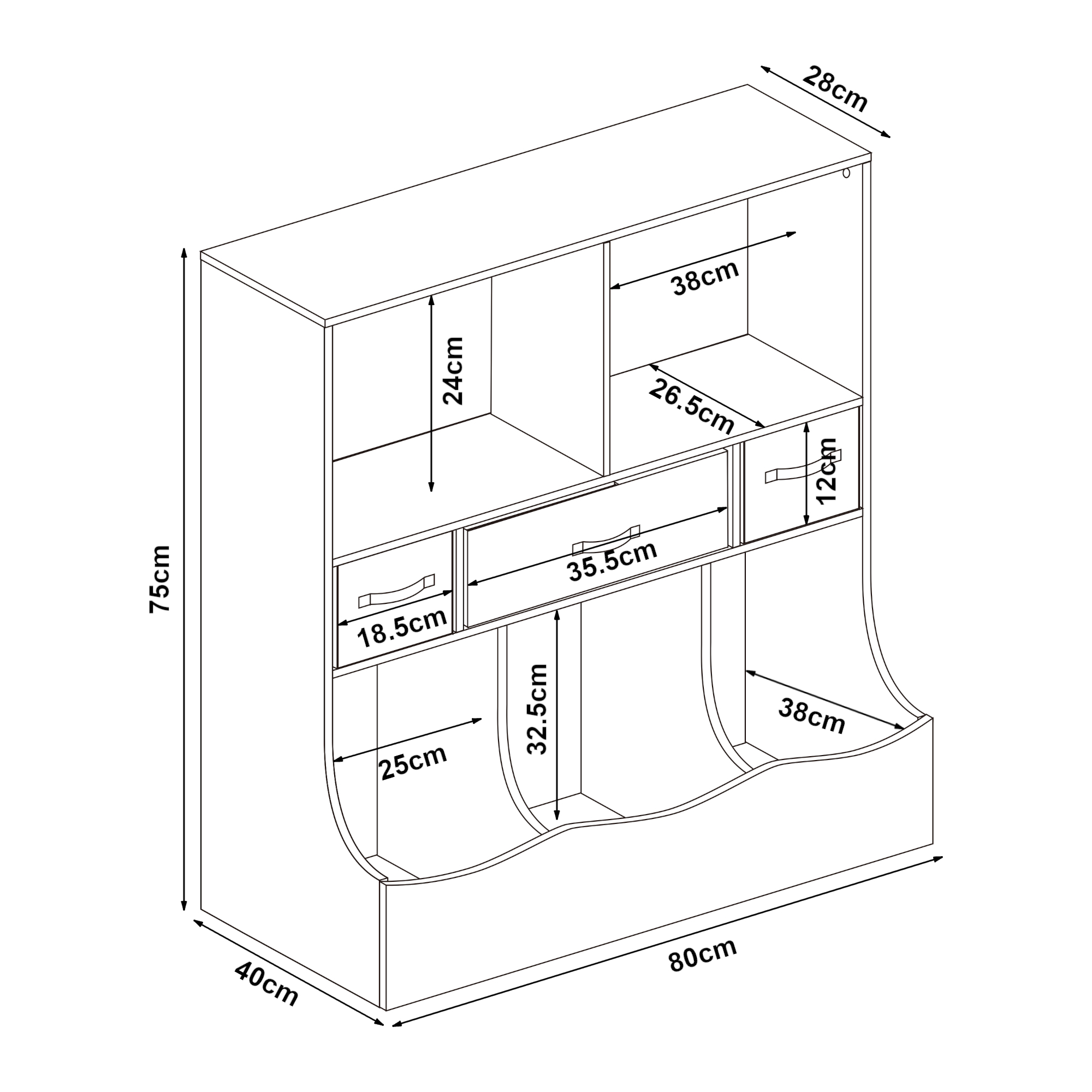 Die zwei Fächer im oberen Bereich eignen sich ideal zum Aufbewahren von Büchern, Spielzeug oder Dekoration. Die drei darunterliegenden Schubladen bestehen aus herausnehmbaren Faltboxen, die zusätzlichen Stauraum für kleinere Dinge bieten und flexibel genutzt werden können, während die geschwungenen unteren Fächer perfekt sind, um größere Gegenstände griffbereit und dennoch ordentlich zu verstauen.