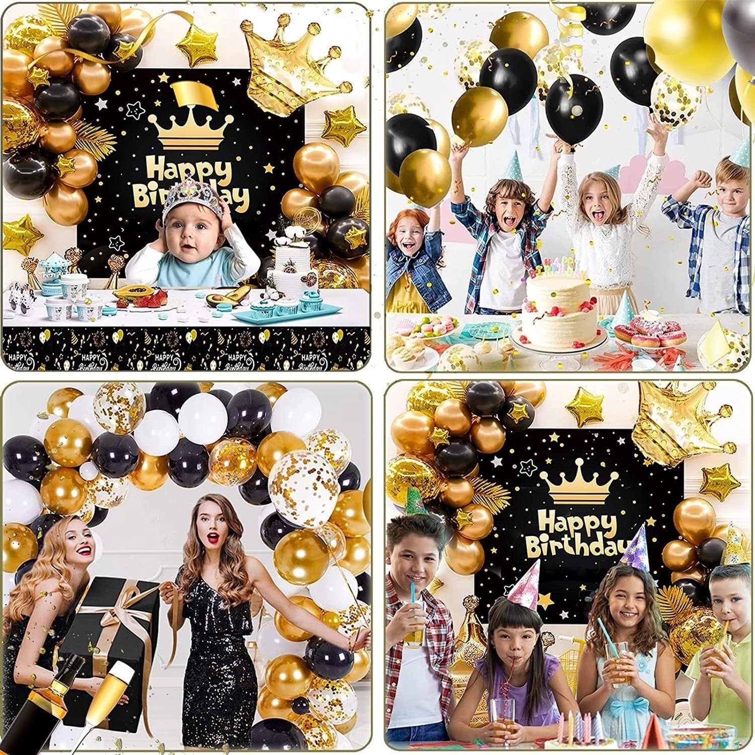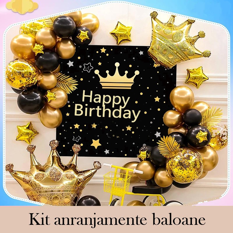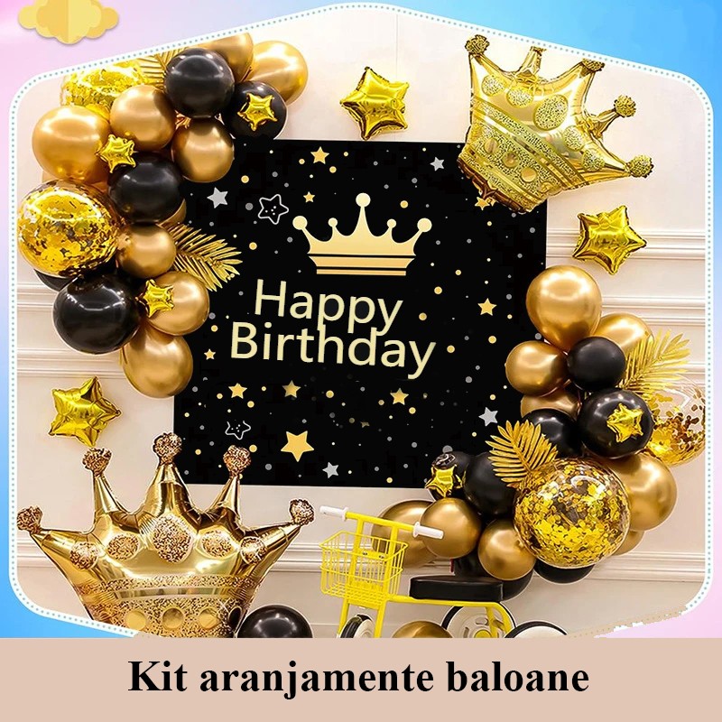 Kit arcadă baloane Happy Birthday cu fundal, latex și folie, negru-auriu