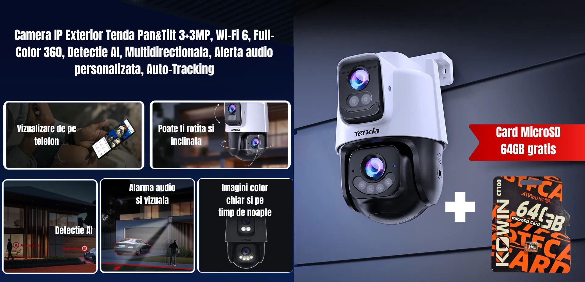 Vrei sa stii cine intra in curtea sau in fata casei tale, zi si noapte, fara sa stai mereu cu ochii pe telefon? Camera Tenda CH9-WCA te ajuta sa supraveghezi toate zonele importante din exterior. Are doua lentile de 3MP care ofera imagini clare, Wi-Fi 6 pentru o conexiune rapida si stabila, si poate fi rotita si inclinata pentru a vedea fiecare colt fara unghiuri moarte. Detectia AI recunoaste automat oameni si vehicule, reducand alertele false. Poti alege ce tip de alerta audio sa fie activata la detectarea miscarii. Este rezistenta la ploaie si praf (IP65) si functioneaza la temperaturi cuprinse intre -30C si +60C. Stocarea imaginilor se realizeaza pe un card SD de 64GB gratuit. Comunicare bidirectionala prin microfon si difuzor integrat.