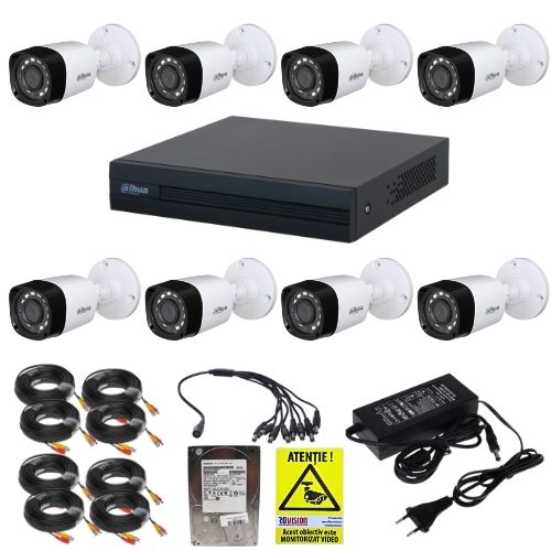 Kit complet Dahua 8 camere 2MP IR 20m, DVR 8 canale 2MP, accesorii, HDD 1TB + Autocolant Rovision SafetyGuard Surveillance
