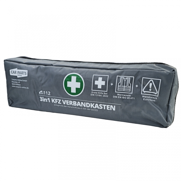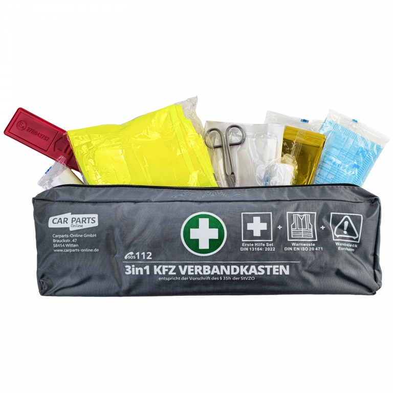 Kit de prim ajutor 3 în 1 pentru mașină – Prim ajutor DIN 13164 | Vestă de siguranță & Triunghi de avertizare | Gri Această set de siguranță auto 3 în 1 practică combină toate componentele legale necesare pentru vehiculul dumneavoastră într-un set compact. Ideal pentru mașini, break-uri, furgonete și autorulote – totul la îndemână și conform StVZO. Caracteristici & Specificații:- Kit de prim ajutor conform DIN 13164 (standard actual)- Vestă de siguranță conform DIN EN ISO 20471- Triunghi de avertizare conform ECE-R27- incl. 2 măști de protecție (3-straturi)- Geantă gri, care economisește spațiu- Conținut de prim ajutor clar organizat- Respectă cerințele legale conform §35h StVZO- Data expirării 06/2029 Conținutul livrării:- 1× Kit de prim ajutor DIN 13164- 1× Vestă de siguranță- 1× Triunghi de avertizare Un set complet de încredere pentru siguranță, control și urgențe – perfect echipat și gata de utilizare imediată.Informații de siguranță ale produsuluiProducător: Carparts-Online GmbHBrauckstr. 47, 58454 WittenContact: info@carparts-online.deInstrucțiuni de siguranță:Notă de siguranță a ambalajului:Există un risc de rănire din cauza marginilor ascuțite de hârtie, carton sau folie, precum și din cauza agrafelor metalice ascuțite.Materialul de ambalare nu este un jucărie. Risc de sufocare pentru copii sau animale.Notă de siguranță a produsului:Articolul ar trebui utilizat doar pentru funcția sa descrisă inițial. Dacă aveți întrebări, vă rugăm să ne contactați folosind detaliile de contact furnizate mai sus