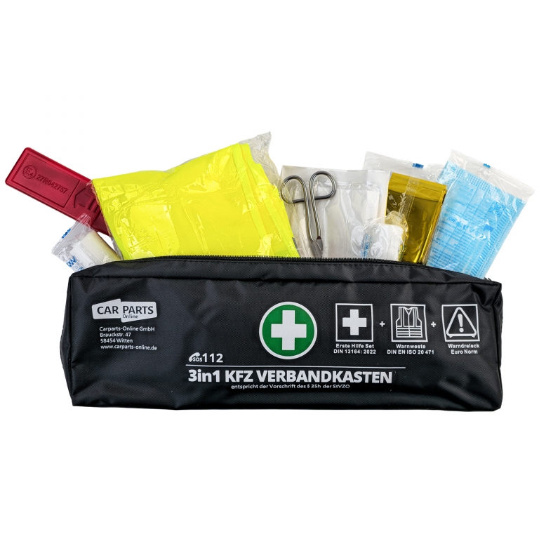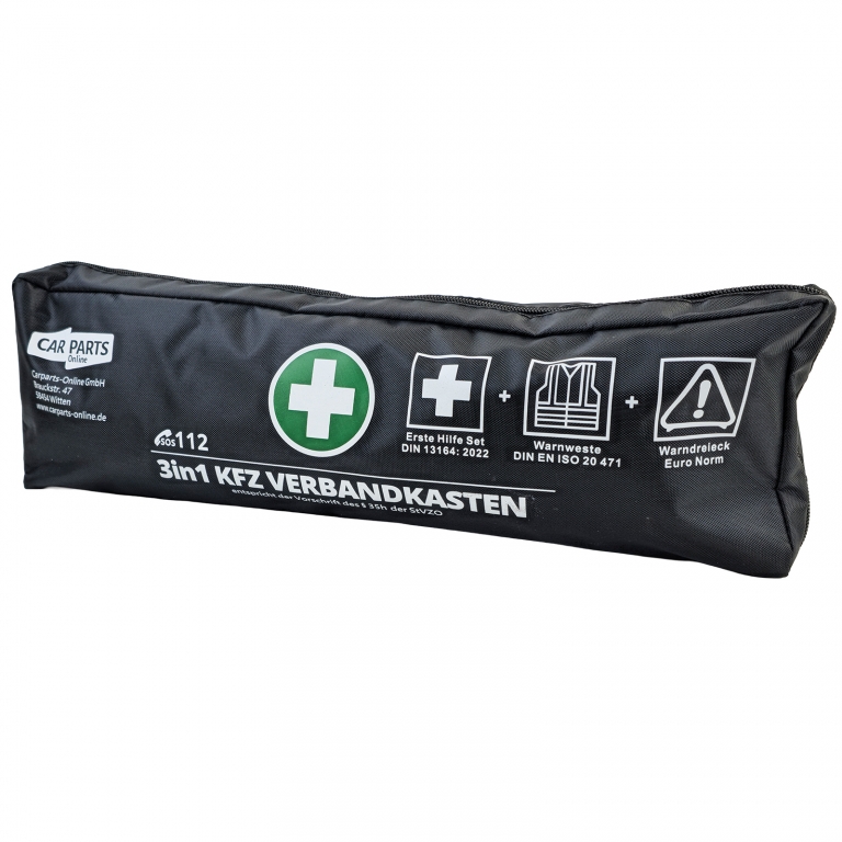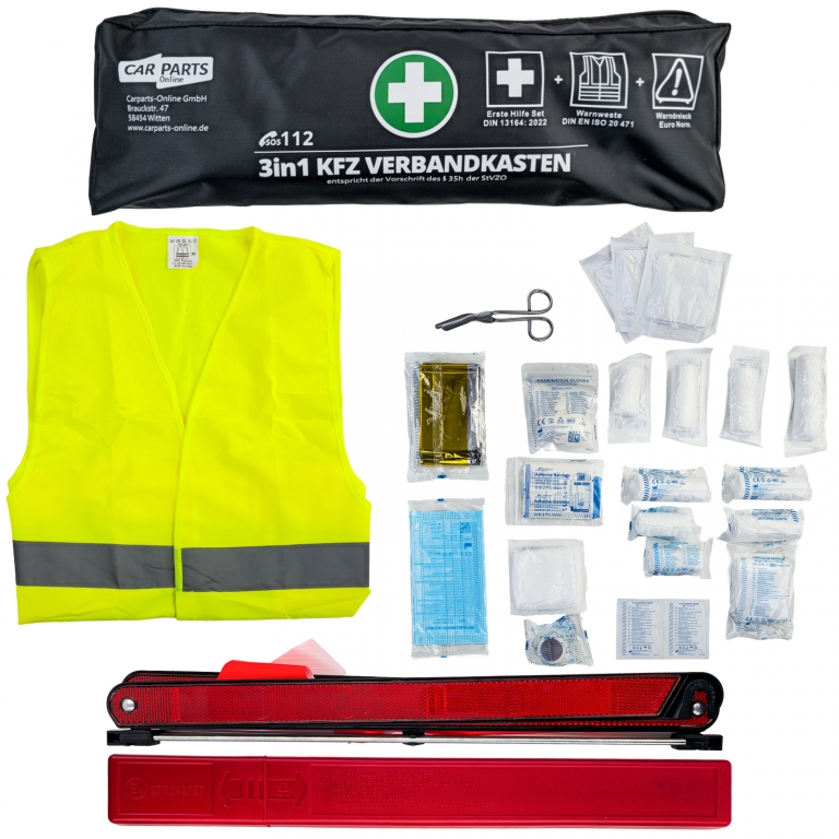 Kit de prim ajutor 3 în 1 pentru mașină – Prim ajutor DIN 13164 | Vestă de siguranță & Triunghi de avertizare | Negru Acest set practic de siguranță auto 3 în 1 combină toate componentele legale necesare pentru vehiculul dumneavoastră într-un set compact. Ideal pentru mașini, break-uri, furgonete și autoutilitare – totul la îndemână și conform StVZO. Caracteristici & Proprietăți:- Kit de prim ajutor conform DIN 13164 (standard actual)- Vestă de siguranță conform DIN EN ISO 20471- Triunghi de avertizare conform ECE-R27- incl. 2 măști de protecție (3-straturi)- Geantă neagră, economisind spațiu- Conținut de prim ajutor organizat clar- Respectă cerințele legale conform §35h StVZO- Data expirării 06/2029 Conținutul livrării:- 1× Kit de prim ajutor DIN 13164- 1× Vestă de siguranță- 1× Triunghi de avertizare Un set complet de încredere pentru siguranță, control și urgențe – perfect echipat și gata de utilizare imediat.Informații de siguranță ale produsuluiProducător: Carparts-Online GmbHBrauckstr. 47, 58454 WittenContact: info@carparts-online.deInstrucțiuni de siguranță:Atenționare privind siguranța ambalajului:Există un risc de rănire din cauza marginilor ascuțite de hârtie, carton sau folie, precum și a clipsurilor metalice ascuțite.Materialul de ambalare nu este o jucărie. Risc de sufocare pentru copii sau animale.Atenționare privind siguranța produsului:Articolul ar trebui utilizat doar pentru funcția sa descrisă inițial. Dacă aveți întrebări, vă rugăm să ne contactați folosind detaliile de contact furnizate mai sus