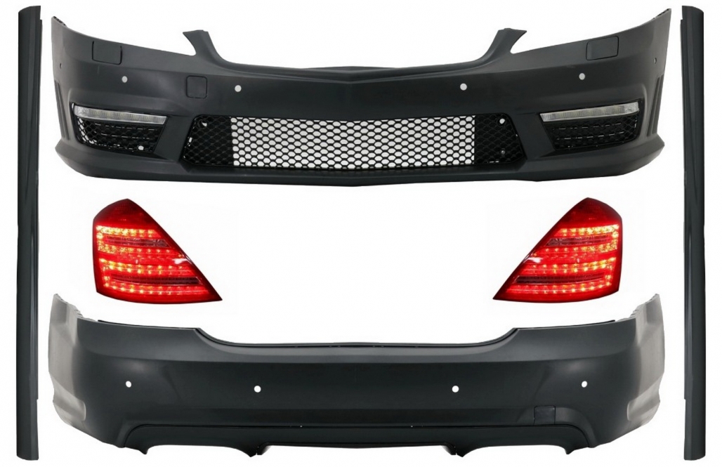 Acest body kit Mercedes S-Class W221 este destinat înlocuirii elementelor exterioare originale pentru obținerea unui aspect facelift. Bara față este livrată complet, cu lumini de zi și grilă centrală, iar bara spate este echipată cu difuzor pentru dublă evacuare. Pentru un montaj perfect, poate fi necesară înlocuirea contra-aripilor. Instructiunile de instalare nu sunt incluse.