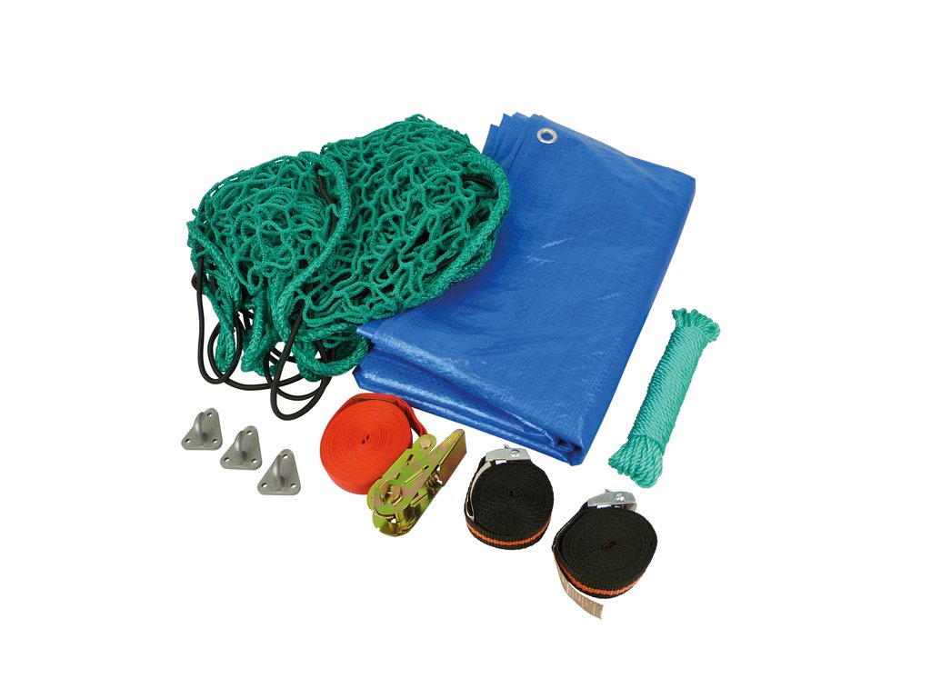 Kit fixare marfa remorca Carpoint 7 piese : plasa 1.5x2.5m , prelata , suruburi , carlige , funie , clichet si doua chingi AutoDrive ProParts