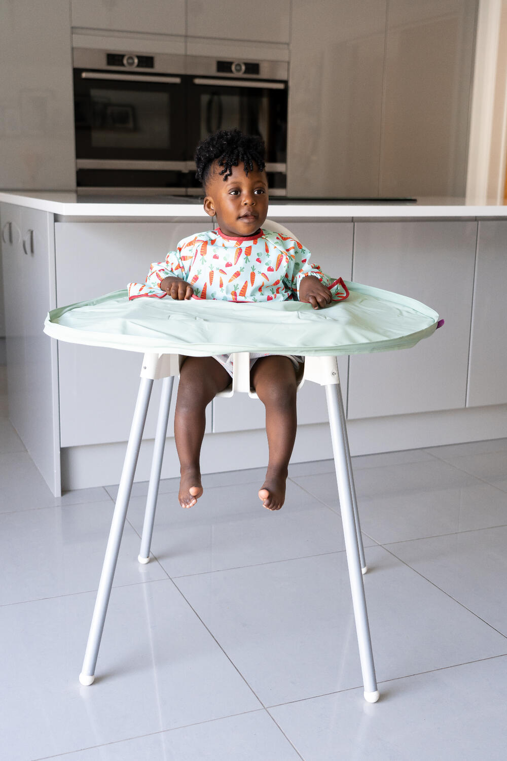 Produsul este gandit pentru parintii care isi doresc mai putin timp petrecut la curatenie si mai mult timp pentru masa, joaca si descoperire. Tava are o culoare contrastanta fata de alimente, contribuind la coordonarea ochi-mana, iar baveta este confortabila si usor de imbracat datorita inchiderii cu arici la gat.