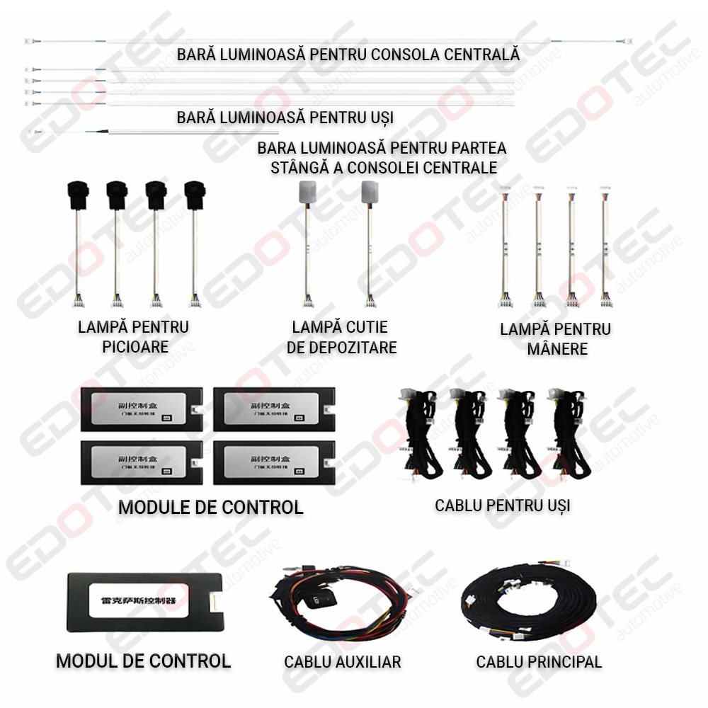 După montaj, kitul poate fi utilizat simplu din aplicația mobilă compatibilă iOS și Android. Activezi Bluetooth, iar sistemul se conectează automat pentru a regla culoarea, intensitatea și modurile de iluminare. Dacă vehiculul permite, controlul se poate realiza și din interfața originală a mașinii.