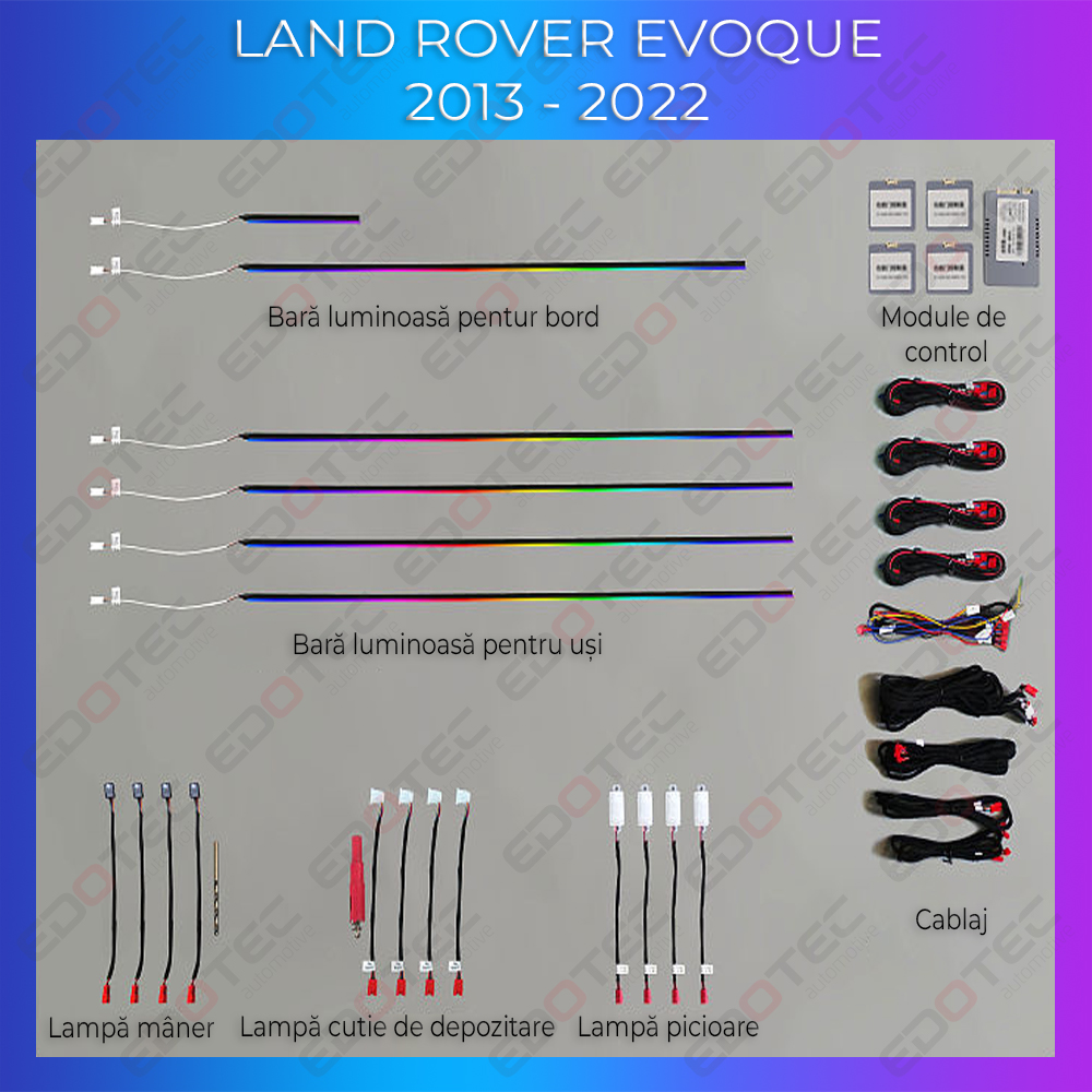 Utilizare: kitul este destinat pentru Range Rover Evoque fabricat intre 2013 si 2022. Dupa instalare, luminile pot fi controlate din aplicatie pe iOS sau Android. Daca masina dispune de suport pentru control OEM, functia poate lucra si prin sistemul original, in functie de configurarea existenta.