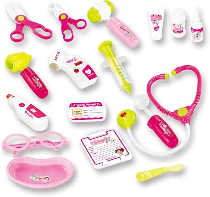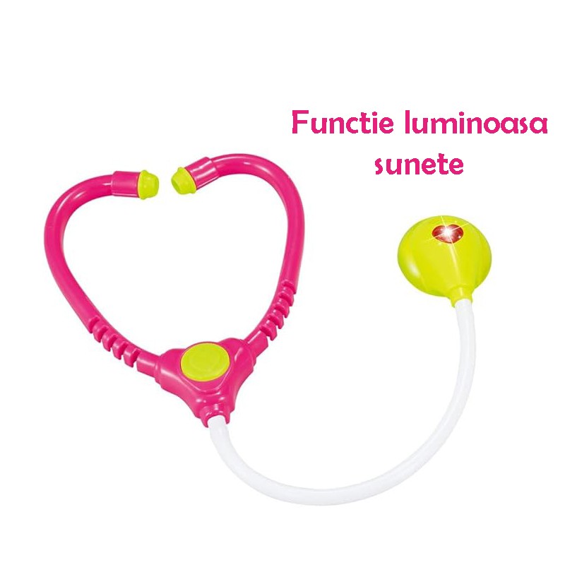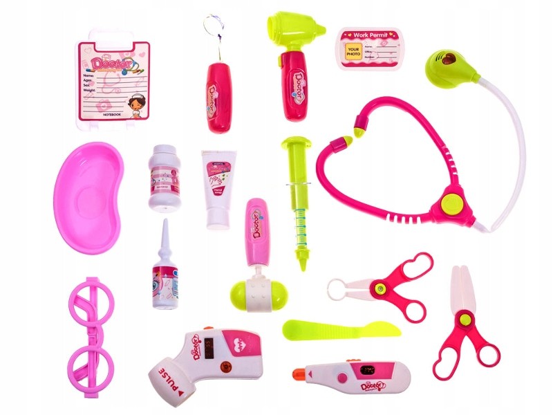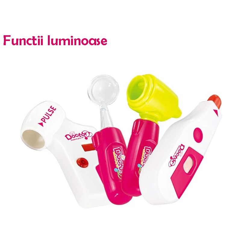- setul include 18 piese: un stetoscop cu sunet bataile inimii si lumina, o oglinda dentara cu lumina, otoscop ORL cu lumina, termometru cu rezultat iluminat, seringa, pulsoximetru cu rezultat iluminat, ciocan neurologic, ochelari, bisturiu, 2 foarfece, o reteta medicala, ecuson de identificare, recipient medicamente, picaturi de ochi, dezinfectant de maini.