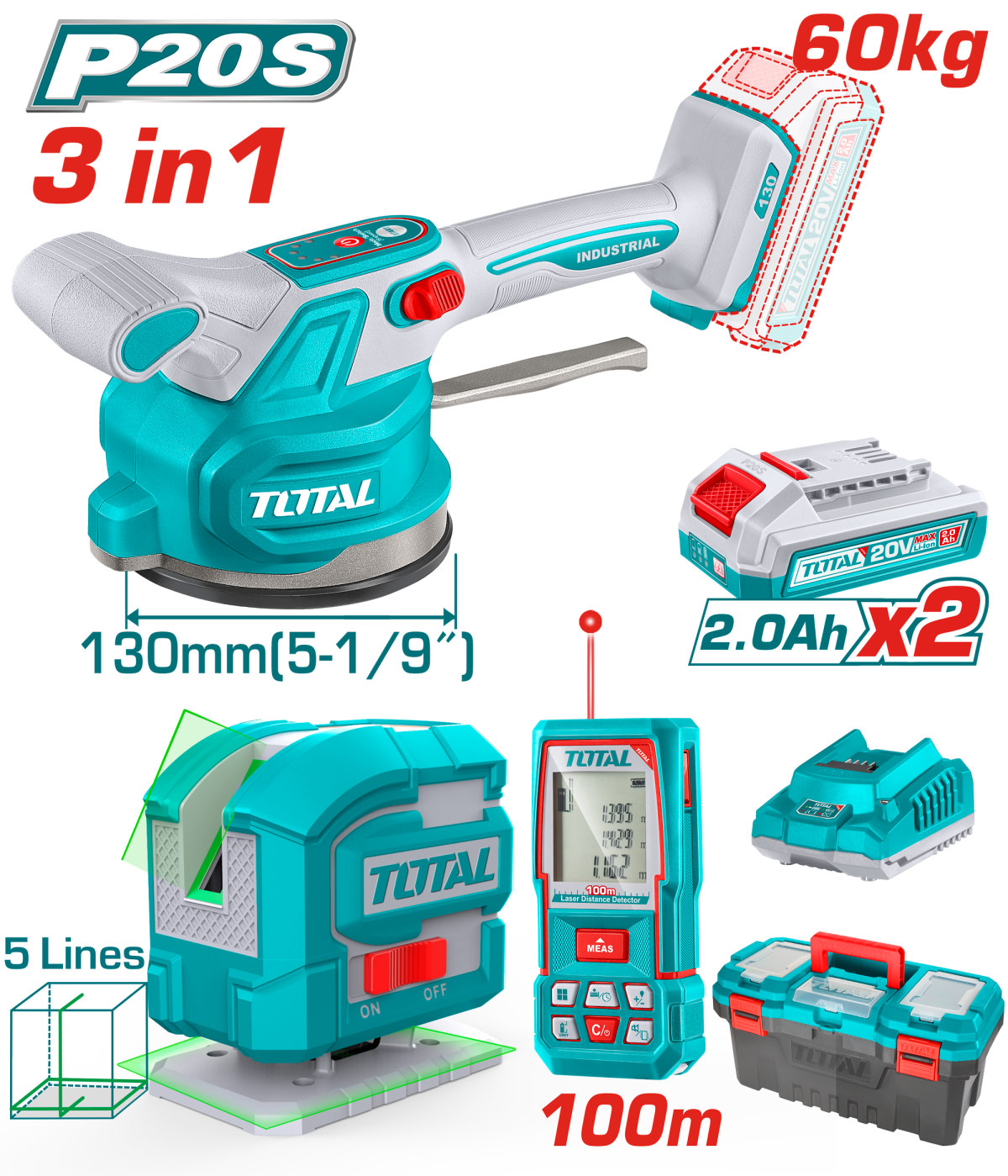 Kit montaj placi ceramice TOTAL 20V 3 in 1 cu vibrator, telemetru si nivela laser