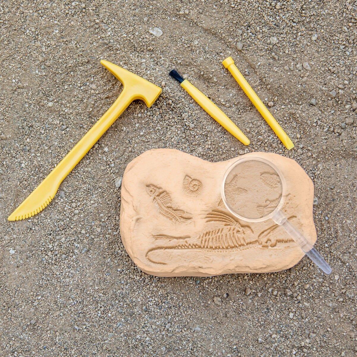 Cu ajutorul ciocanului si daltei adaptate pentru cei mici, copilul poate excava cu grija blocul de ipsos pentru a descoperi 8 fosile reale. Dupa extragere, piesele pot fi curatate cu pensula inclusa si analizate in detaliu cu lupa, pentru o experienta cat mai apropiata de munca unui paleontolog.