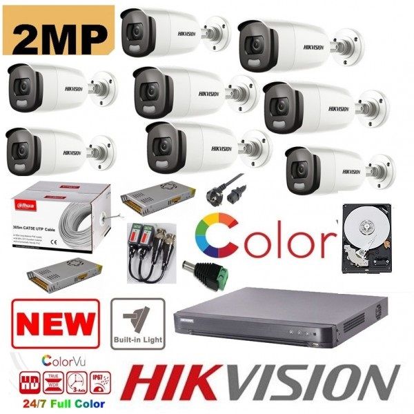 Kit supraveghere 8 camere profesional Hikvision 2mp Color Vu cu IR 40m (color noapte ) , accesorii incluse, HDD 2TB SafetyGuard Surveillance