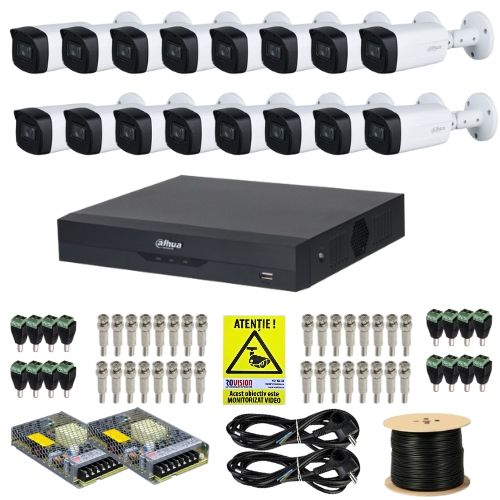 Protejeaza eficient spatii comerciale, hale, curti, depozite sau cladiri de mari dimensiuni cu acest kit supraveghere Dahua 16 camere 5MP, pregatit pentru monitorizare clara zi si noapte. Sistemul include 16 camere exterior Dahua Starlight cu IR 80 m, lentila fixa de 3.6 mm si carcasa IP67, alaturi de un DVR Dahua 16 canale WizSense cu functii inteligente de analiza video. Pachetul este completat cu cablu, surse si conectori, pentru o instalare practica si fiabila.