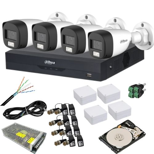 Protejeaza eficient locuinta, biroul sau spatiul comercial cu acest kit supraveghere Dahua 4 camere 5MP, pregatit pentru instalare si utilizare imediata. Sistemul include 4 camere analog de exterior, un DVR 4 canale, HDD 1TB pentru stocare, sursa de alimentare si accesoriile necesare montajului. Este o solutie practica pentru cei care cauta imagini clare, monitorizare permanenta si administrare simpla de la distanta.