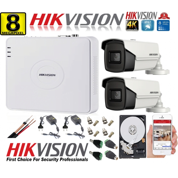 Kit supraveghere Hikvision 2 camere 8MP 4K, DVR 4 canale, IR 80m, HDD inclus