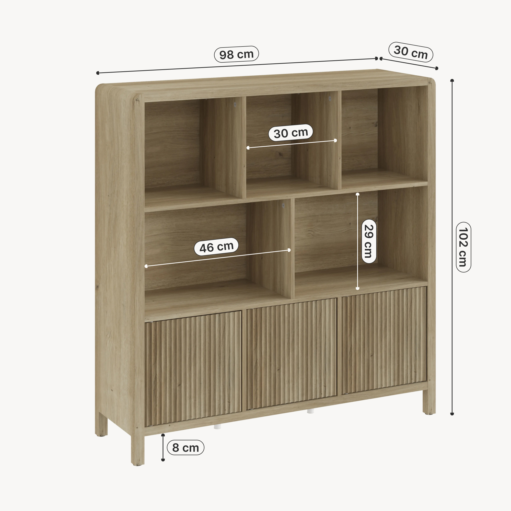 Der Wohnzimmerschrank ist ein stilvolles und praktisches Möbelstück, das Ihnen die perfekte Ergänzung für Ihren Wohnraum bietet. Er verfügt über sechs kleinere Fächer, von denen drei mit Türen ausgestattet sind, sowie über zwei große offene Ablagefächer.