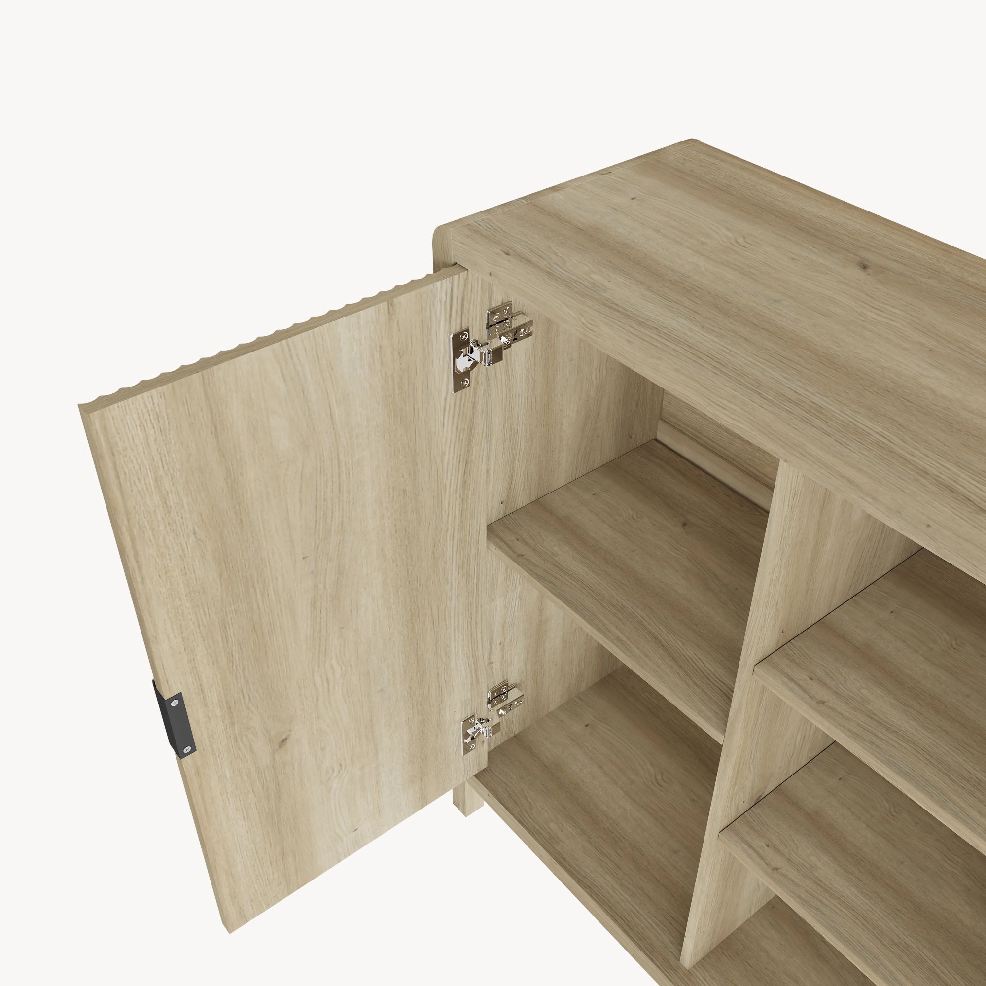 Diese Kommode verbindet modernes Design mit praktischem Stauraum für Ihr Zuhause. Drei offene Fächer und eine Tür mit geriffelter Front verleihen ihr eine besondere Ausstrahlung und setzen einen stilvollen Akzent im Wohnraum.