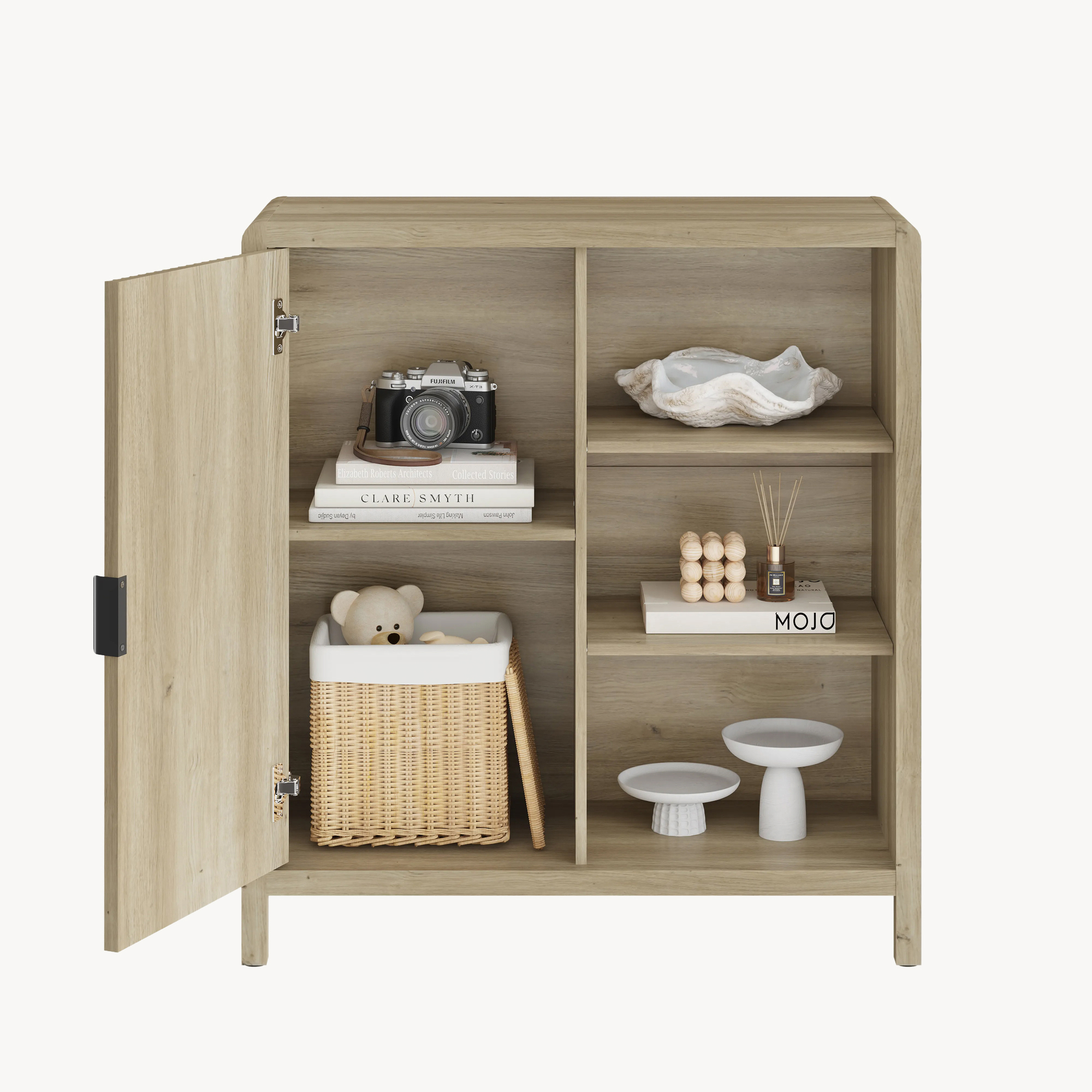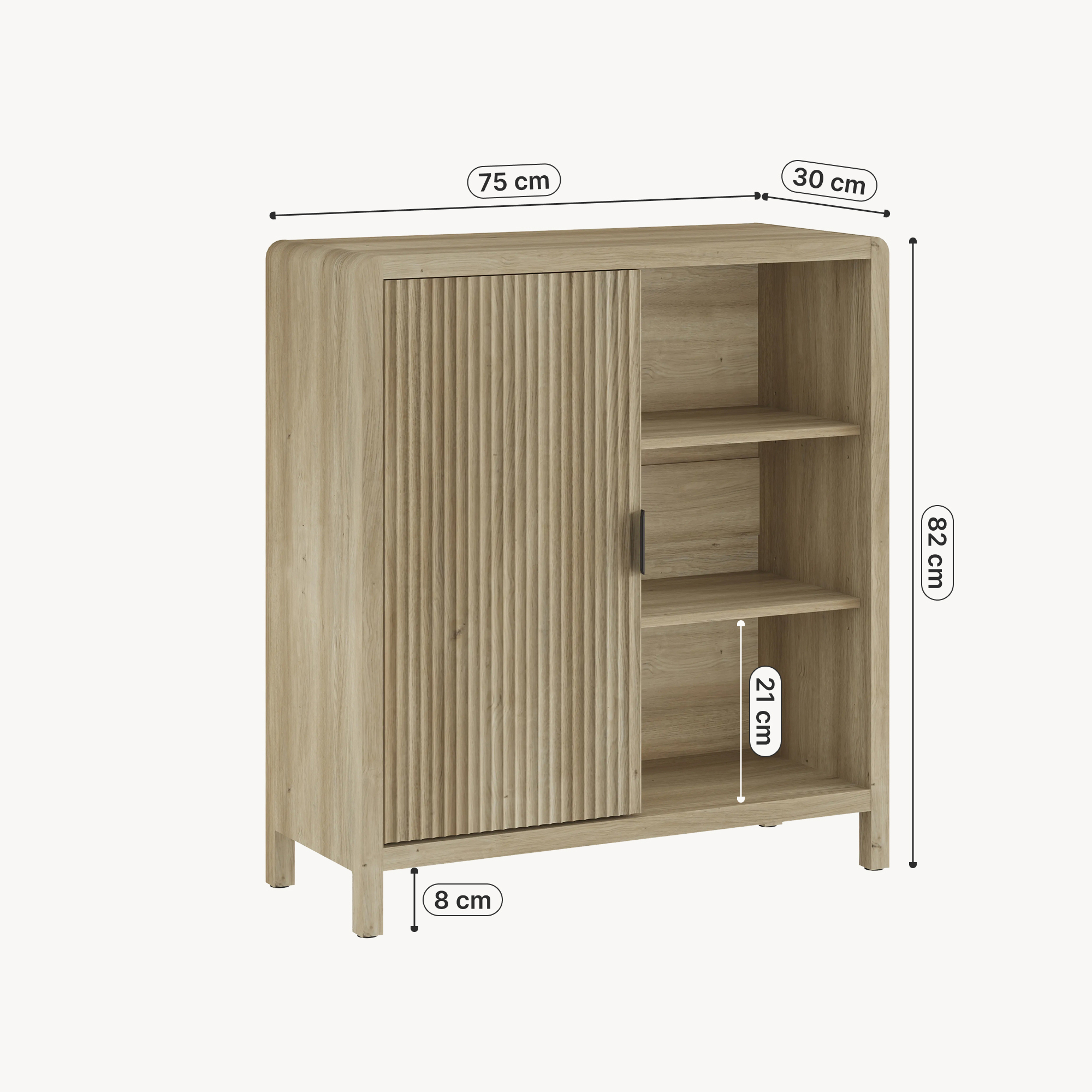 Hinter der Tür stehen Ihnen zwei übersichtlich angeordnete Fächer zur Verfügung, ideal für Bücher, Geschirr, Gläser oder Unterlagen. Die drei offenen Fächer bieten zusätzlichen Platz für Dekoration, Pflanzen oder persönliche Lieblingsstücke.