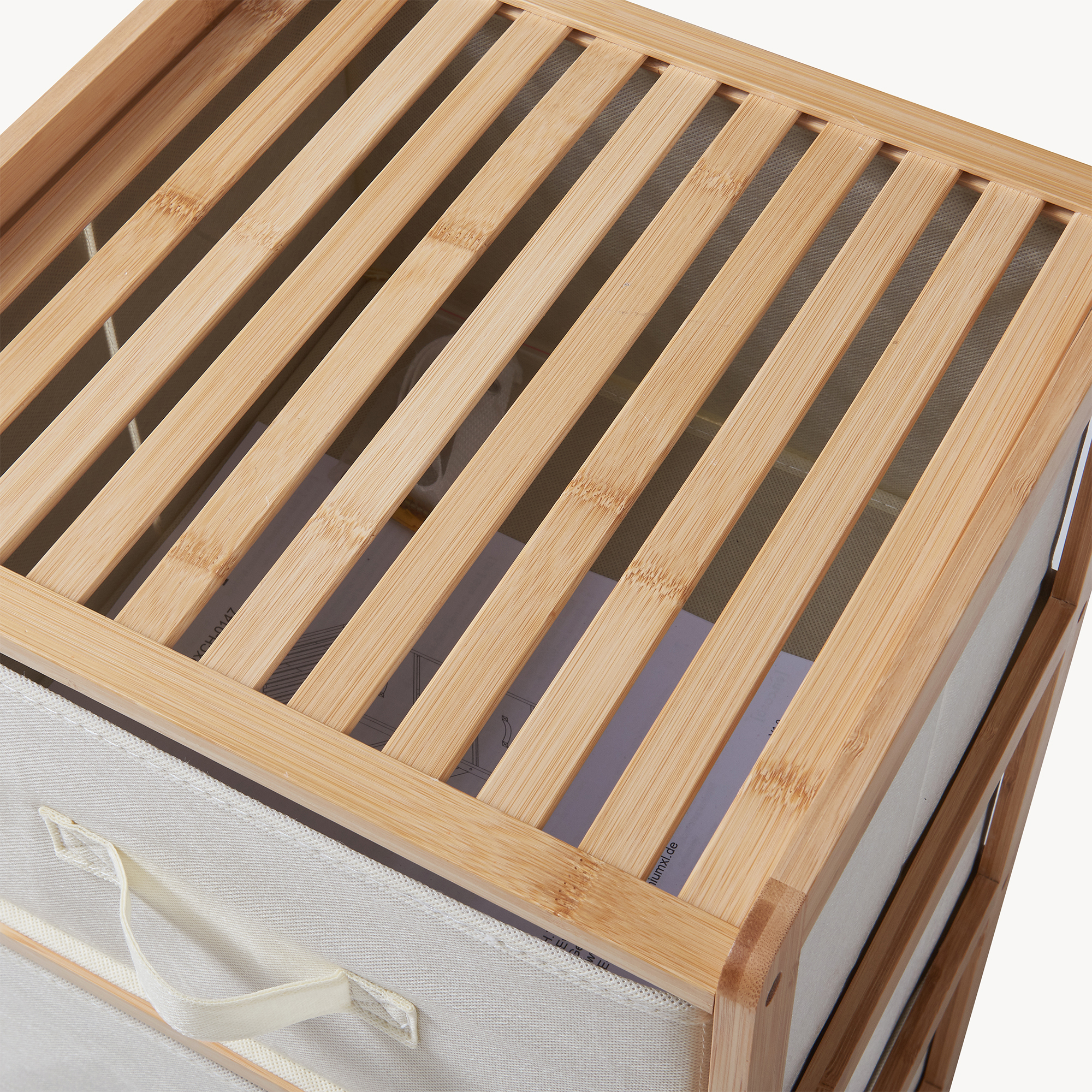 Diese moderne Kommode mit Stoffschubladen kombiniert ein stabiles Bambusgestell mit funktionalem Stauraum und eignet sich ideal für Schlafzimmer, Flur oder Ankleidezimmer. Das natürliche Design fügt sich harmonisch in verschiedene Wohnkonzepte ein und sorgt für eine aufgeräumte Atmosphäre.