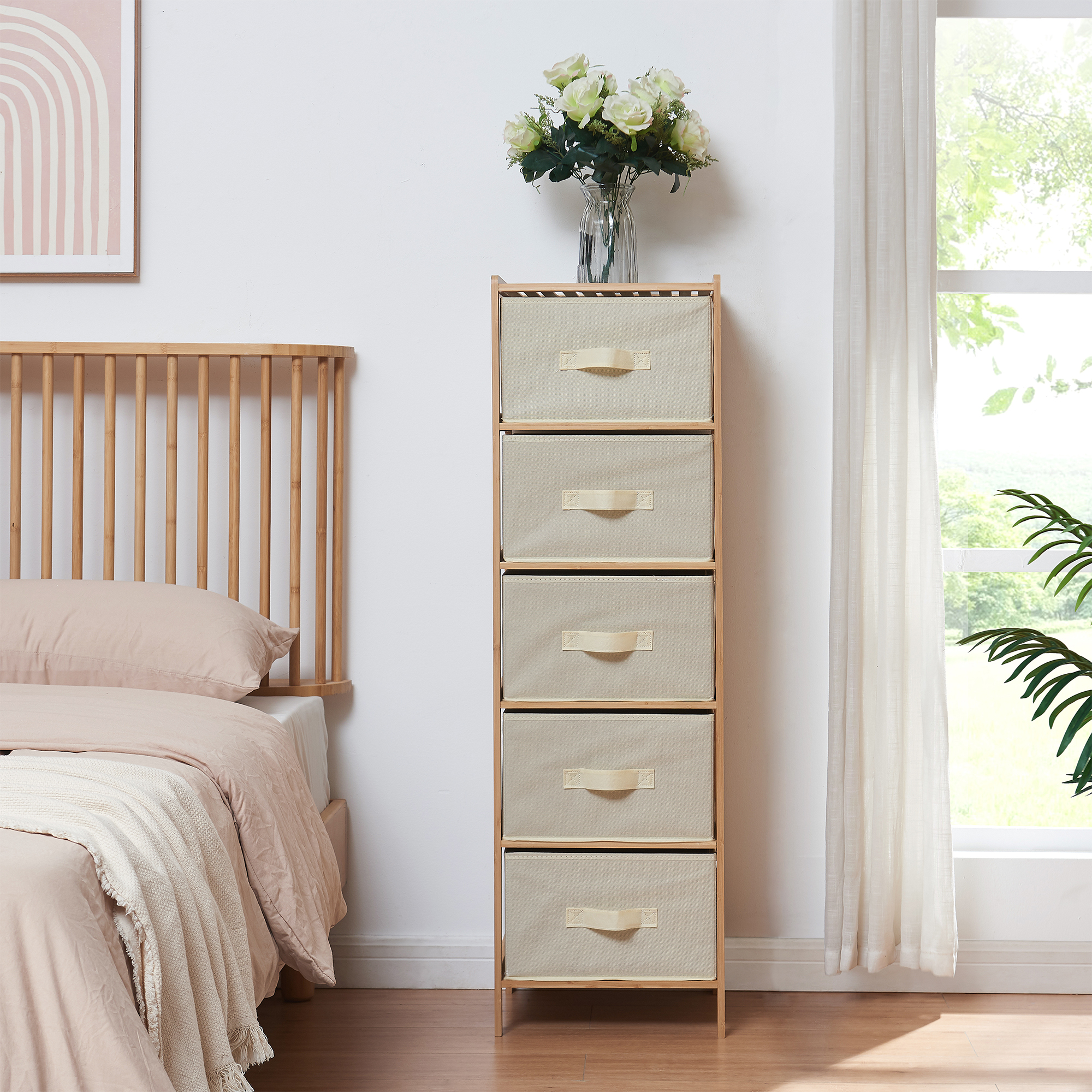 Diese moderne Kommode mit Stoffschubladen kombiniert ein stabiles Bambusgestell mit funktionalem Stauraum und eignet sich ideal für Schlafzimmer, Flur oder Ankleidezimmer. Das natürliche Design fügt sich harmonisch in verschiedene Wohnkonzepte ein und sorgt für eine aufgeräumte Atmosphäre.