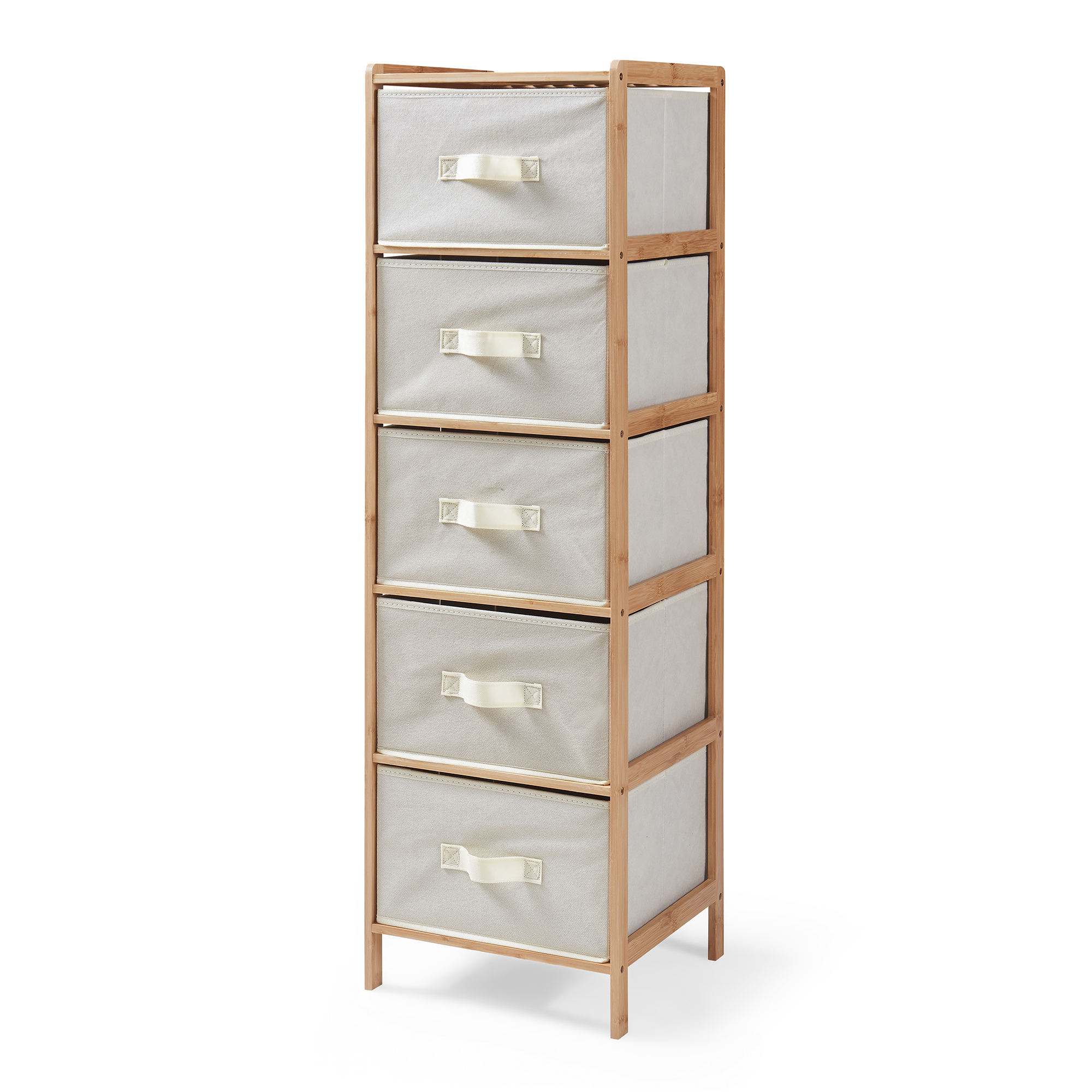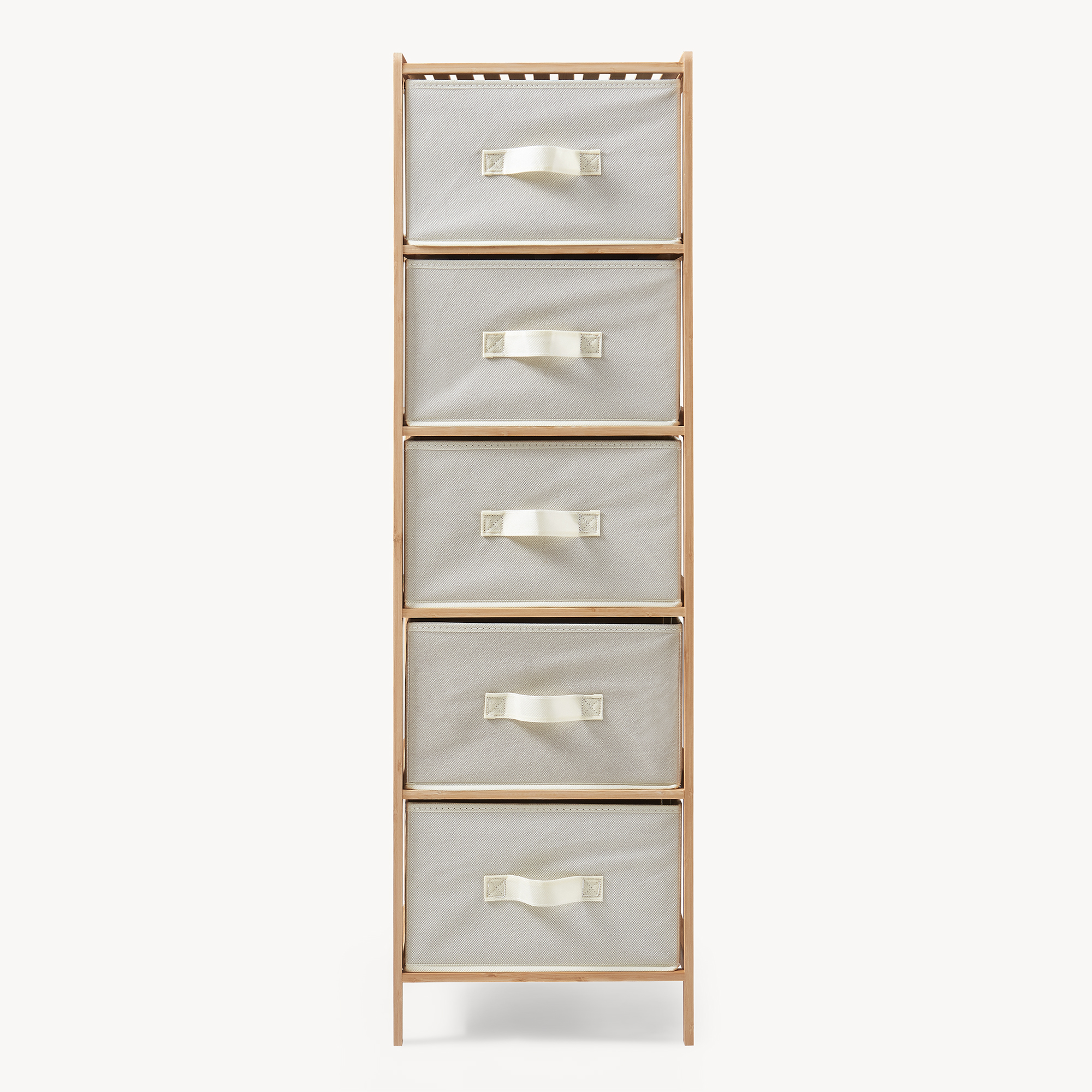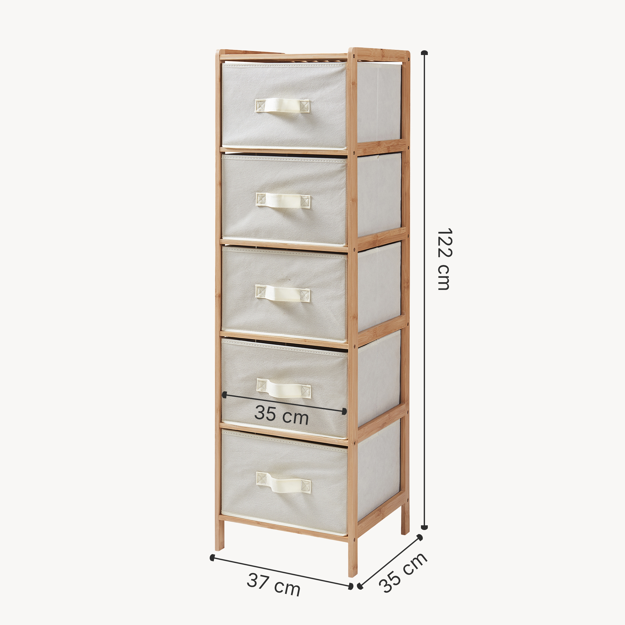 Fünf großzügige Stoffboxen mit Griffschlaufen ermöglichen eine übersichtliche Organisation von Kleidung, Accessoires oder Haushaltsartikeln. Durch die leichtgängige Handhabung lassen sich Inhalte schnell erreichen und ordentlich verstauen.