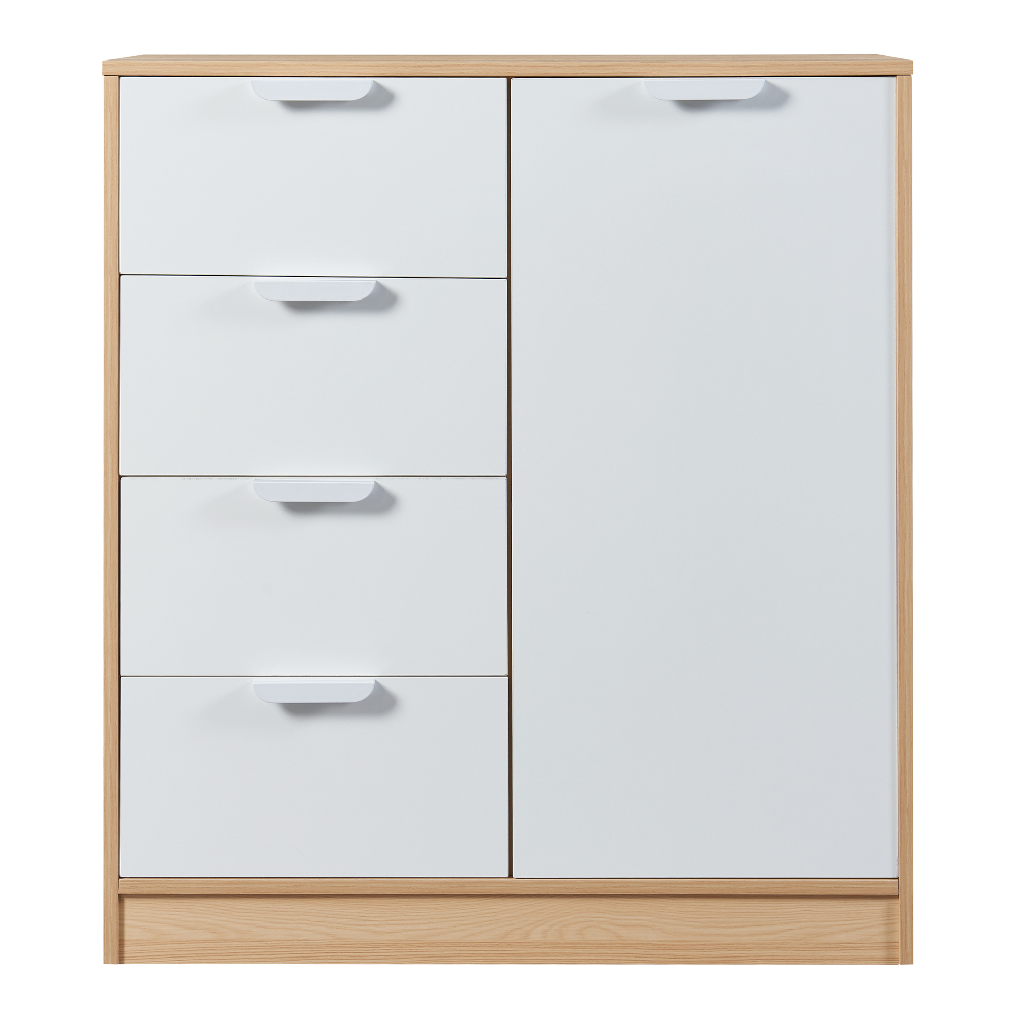 - Zeitlose Kommode mit vier geräumigen Schubladen und einer Schranktür