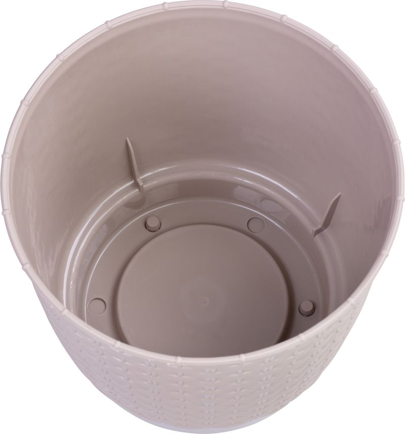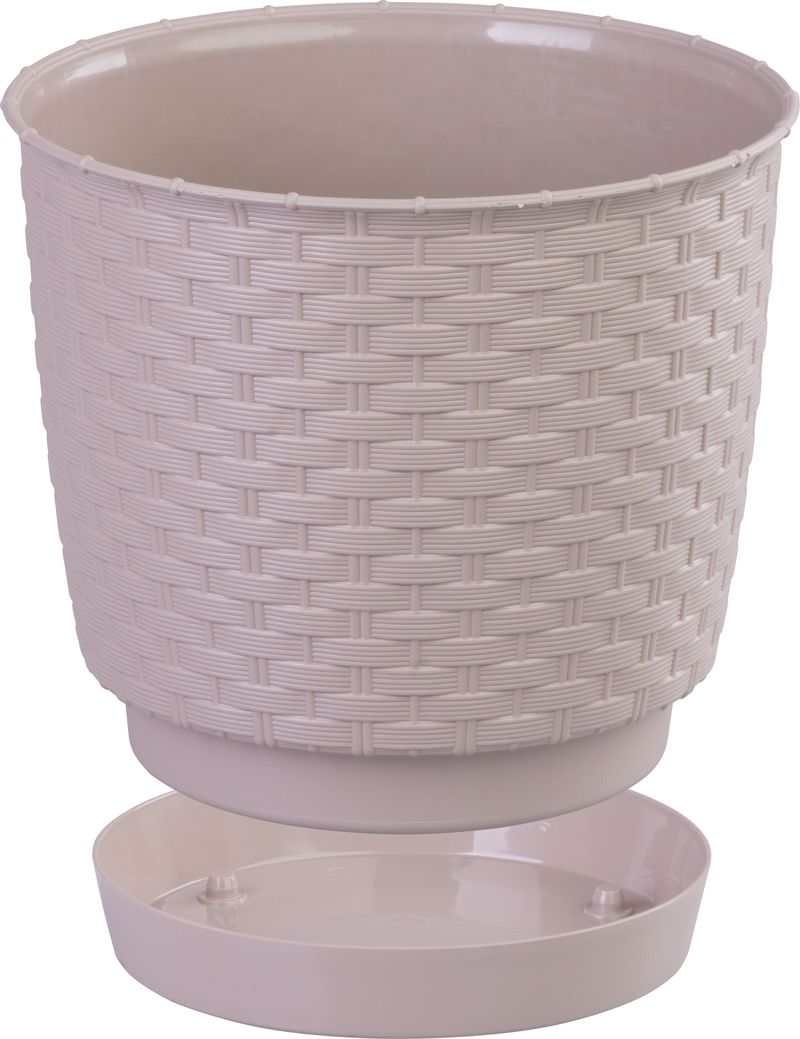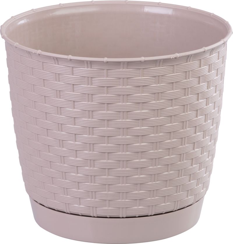 Okrúhly kvetináč s miskou svojou textúrou verne imituje prírodný ratanový výplet. Elegantný motív kvetináča možno využiť v interiéri aj v exteriéri. Dokonale sa hodí do letných záhradiek, kaviarní či reštaurácií.