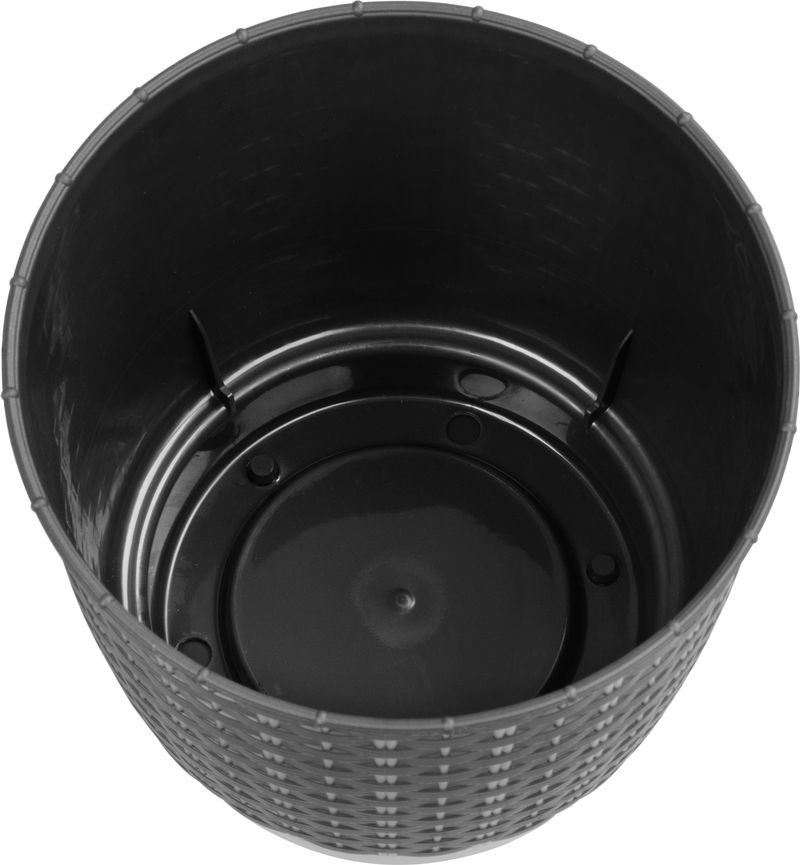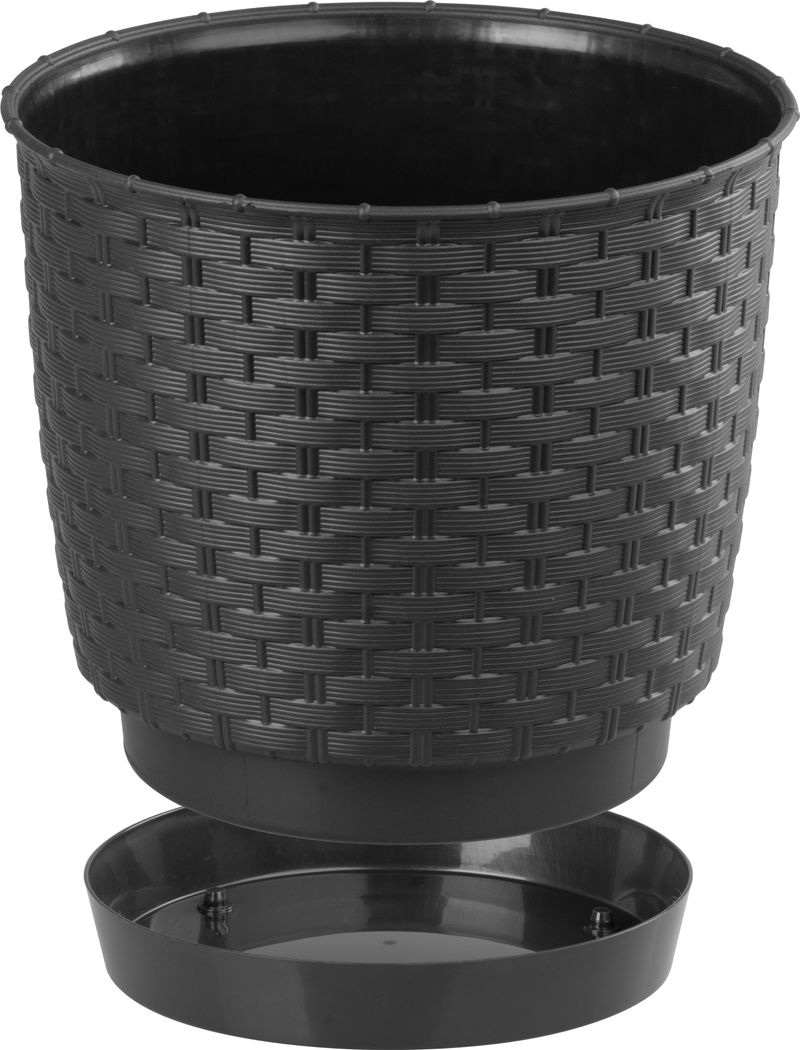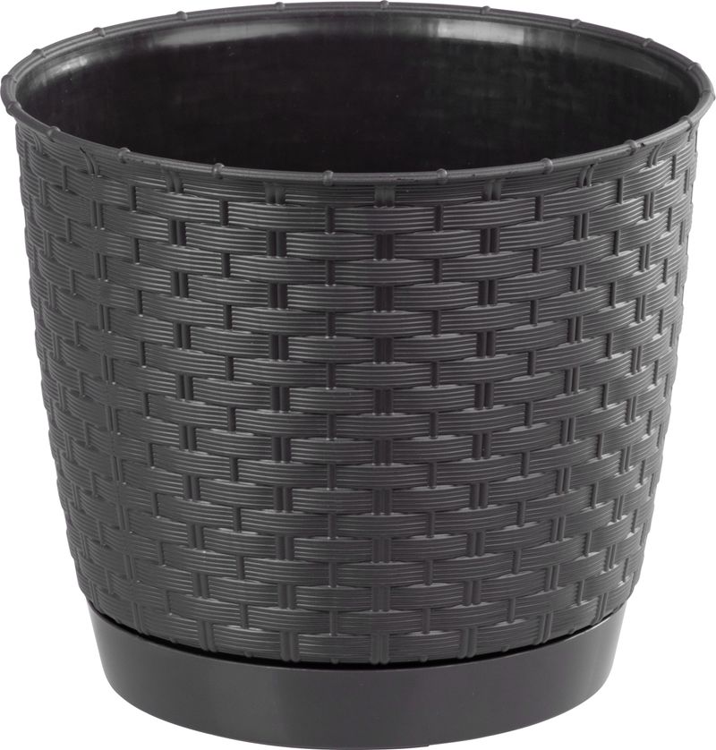 Okrúhly kvetináč s miskou svojou textúrou verne imituje prírodný ratanový výplet. Elegantný motív kvetináča možno využiť v interiéri aj v exteriéri. Dokonale sa hodí do letných záhradiek, kaviarní či reštaurácií.