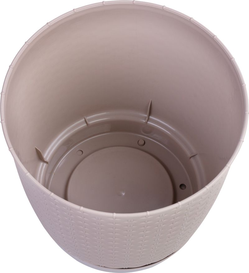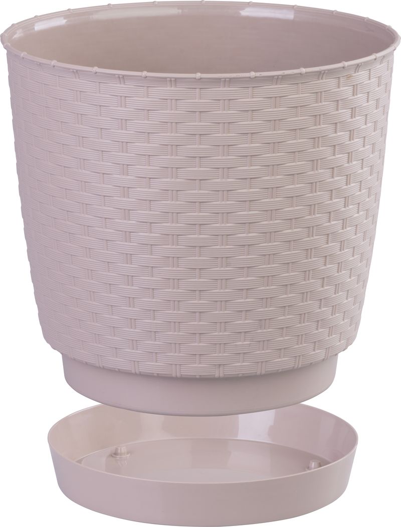 Okrúhly kvetináč s miskou svojou textúrou verne imituje prírodný ratanový výplet. Elegantný motív kvetináča možno využiť v interiéri aj v exteriéri. Dokonale sa hodí do letných záhradiek, kaviarní či reštaurácií.