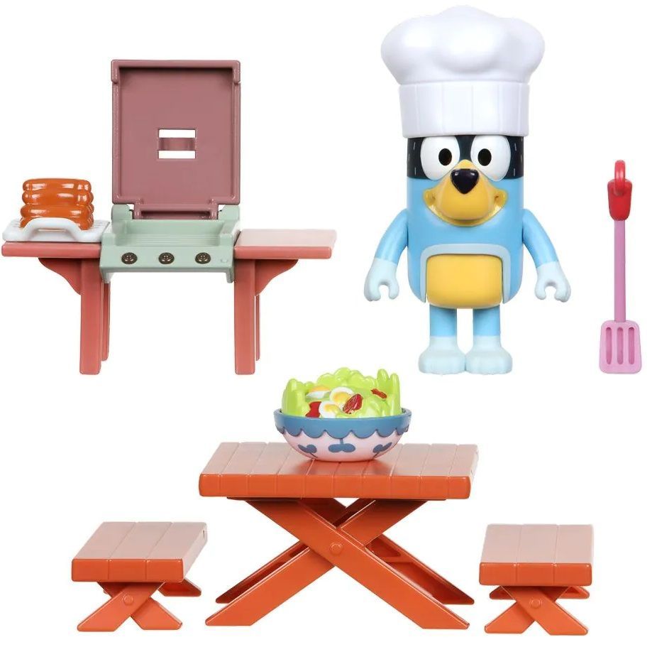 Bluey Mini-Kit Backyard Bluey, este un serial animat pentru copii prescolari. Popularitatea sa reflecta interesul imens pentru jucariile din serie. Bluey este o catea adorabila Blue Heeler, in varsta de 6 ani, care, impreuna cu sora ei Bingo, ii place sa transforme viata de familie de zi cu zi in aventuri nesfarsite. Cu jucariile si figurinele de plus Bluey, vei recrea acasa cele mai memorabile momente din serie. Jucariile de plus Bluey sunt placute la atingere si sunt realizate din tesaturi moi, blande, potrivite pentru imbratisare. Figurile sunt colorate si realizate cu grija din materiale de inalta calitate. Au brate si corp mobile. Seturile tematice disponibile vin cu o varietate de accesorii interesante pentru a imbogati jocul cu figurinele. Bandit (tatal lui Bluey) este un maestru gratar si ii place sa gateasca o cina delicioasa pentru familia lui. Imbracat cu sortul si palaria de bucatar, este o figura unica disponibila doar in acest set. Are chiar si o spatula pentru a va intoarce mancarea pe gratar! Setul include un gratar, masa de picnic, 2 banci si 3 portii delicioase de mancare!