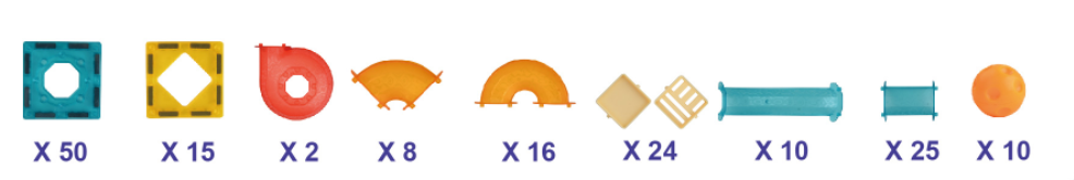 - Continut set: 50 patrate cu decupaj hexagonal, 15 patrate cu decupaj romb, 85 piese diferite pentru realizarea circuitului, 10 bile