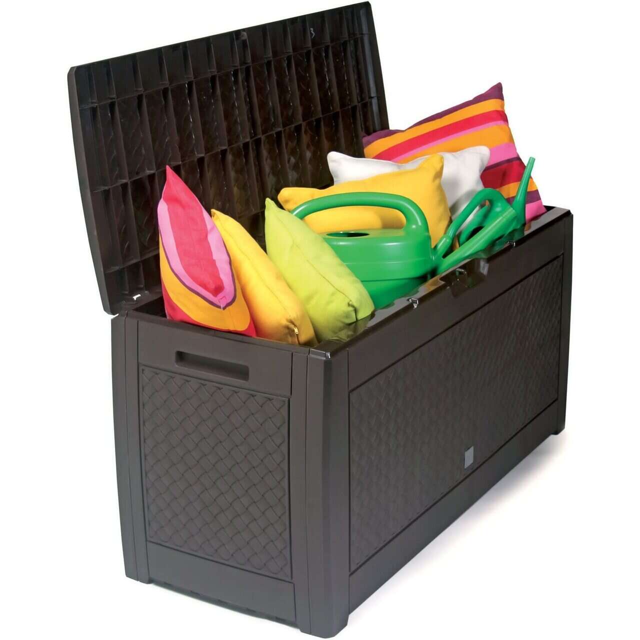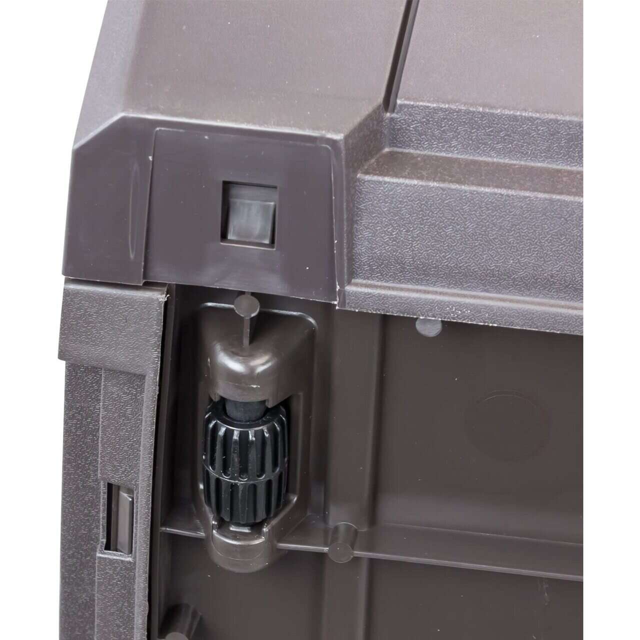 Aceasta lada este ideala pentru depozitarea diverselor articole din gradina deoarece este foarte spatioasa si practica. Culoarea inchisa, maro si textura suprafetei, care seamana cu o tesatura naturala, se potrivesc se imbina perfect in peisajul oricarei gradini, dar acest produs poate fi amplasat si pe o terasa sau intr-un foisor ori in magazie, pentru stocarea uneltelor de gradina. Lada este dotata si cu doua manere pe peretii laterali si este usor de transportat deoarece are montate roti la baza. Produsul este echipat si cu un capac special la care se poate atasa si un lacat. Plasticul din care este fabricat este de cea mai inalta calitate, rezistent la radiatiile UV.