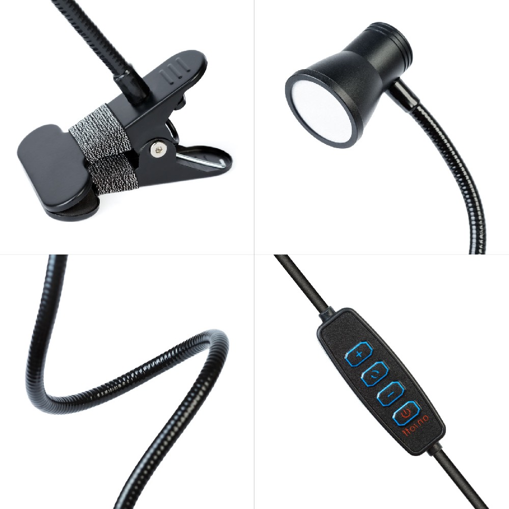 Brațul flexibil și rezistent din metal permite orientarea precisă a fasciculului luminos, iar clema cu burete de protecție asigură o fixare fermă. Lampa se alimentează prin port USB-A, fiind compatibilă cu laptop, adaptor sau powerbank.