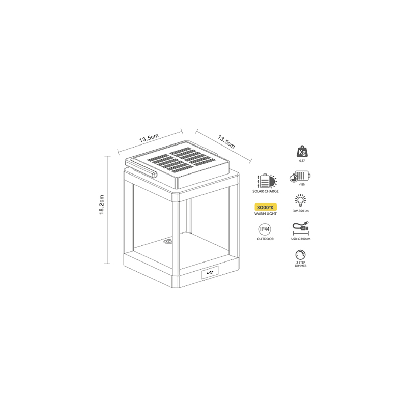 SUNNY este o lampă de masă solară reîncărcabilă, perfectă pentru terasă, balcon, grădină sau camping. Oferă o lumină caldă și plăcută, iar panoul solar integrat din partea superioară îți permite să o încarci simplu, fără bătăi de cap. Pentru flexibilitate, se poate încărca și prin USB-C.