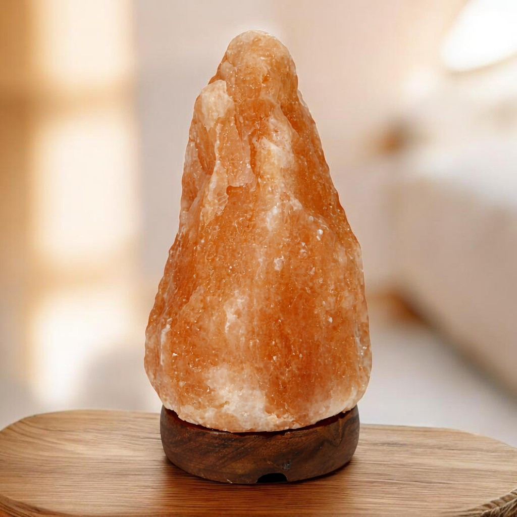 Lampă de sare Himalaya 1–2 kg cu suport din lemn, lumină ambientală caldă