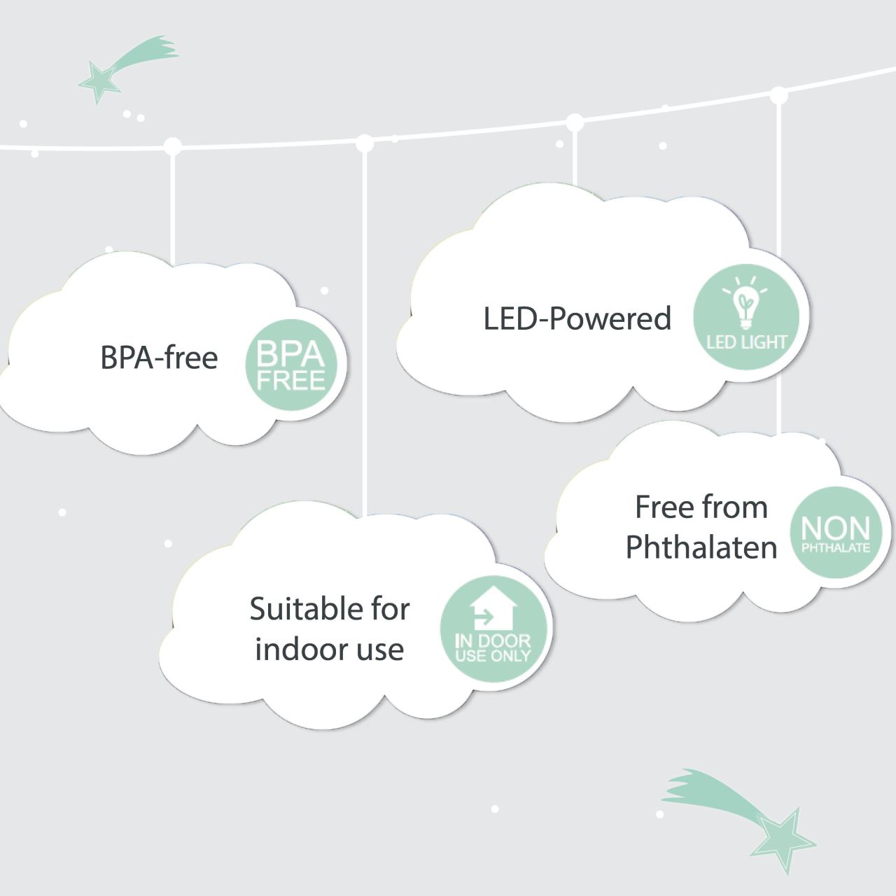 Modelul este gandit pentru siguranta celor mici: compartimentul pentru baterii este prevazut cu surub, iar materialele utilizate sunt fara BPA si ftalati. Datorita tehnologiei LED cu degajare redusa de caldura, lampa poate fi folosita pe termen lung fara risc de supraincalzire. Este potrivita pentru noptiera, comoda sau coltul de somn al bebelusului.