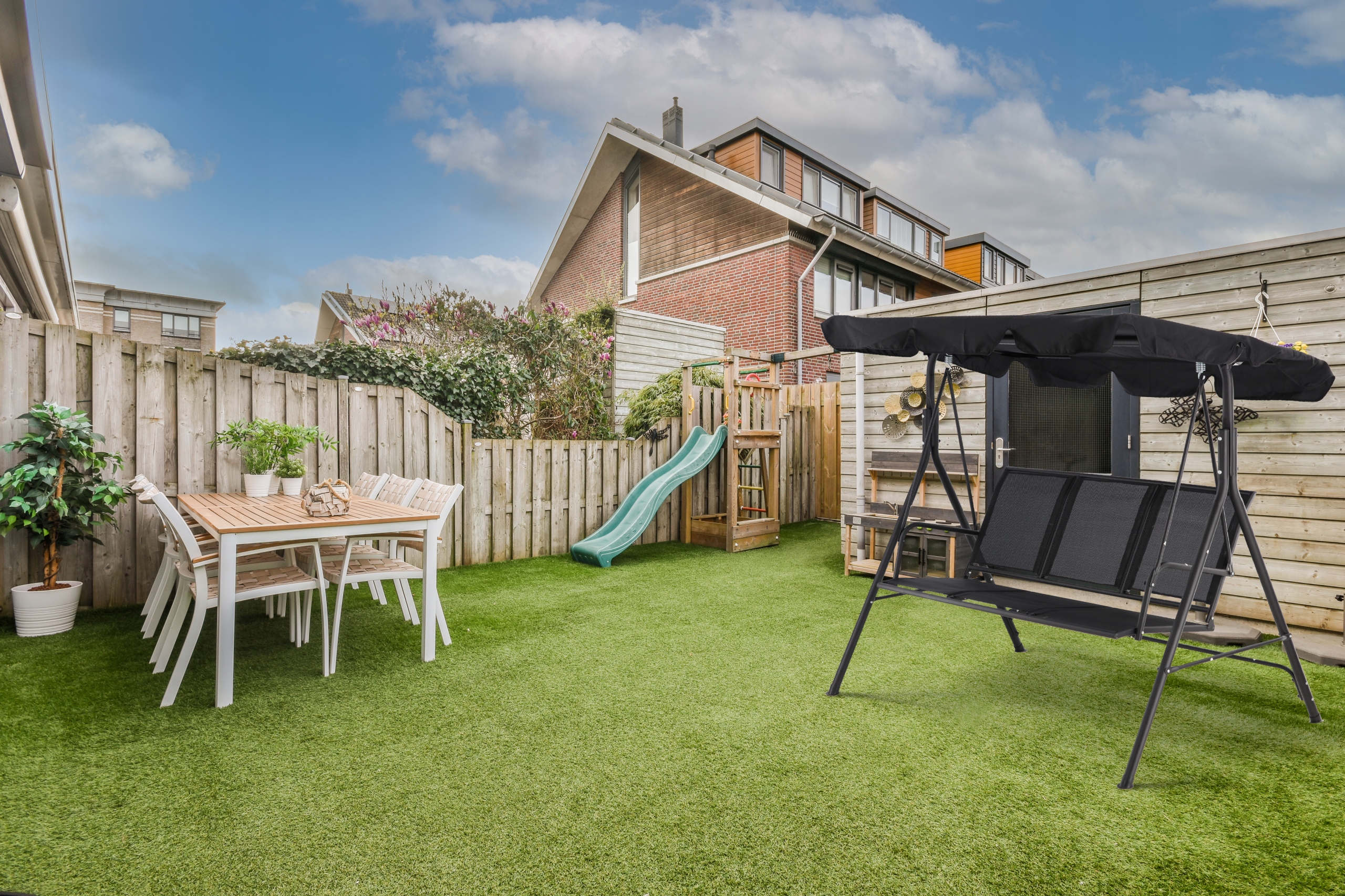 Poate fi folosit zilnic pentru relaxare, citit, socializare sau pauze confortabile in exterior. Se monteaza usor cu elementele de fixare incluse, iar baldachinul poate fi ajustat sau indepartat complet, in functie de preferinte si de vreme.