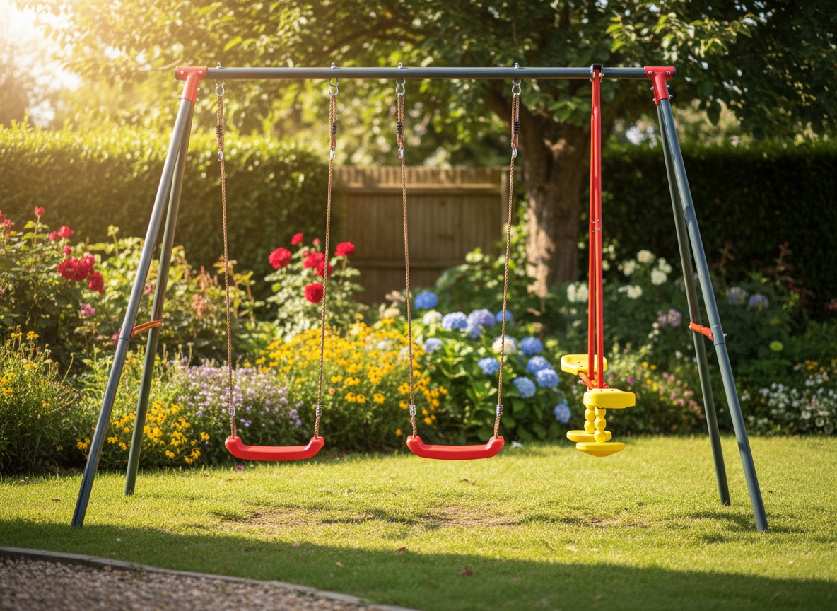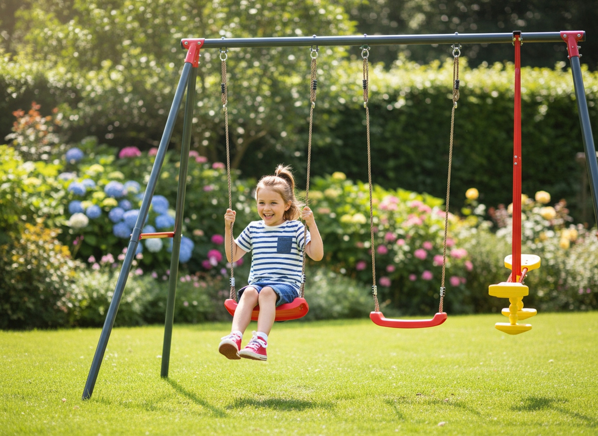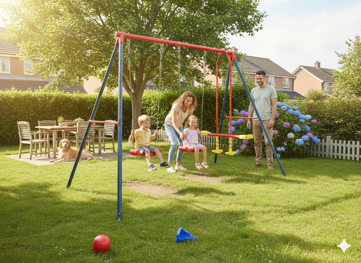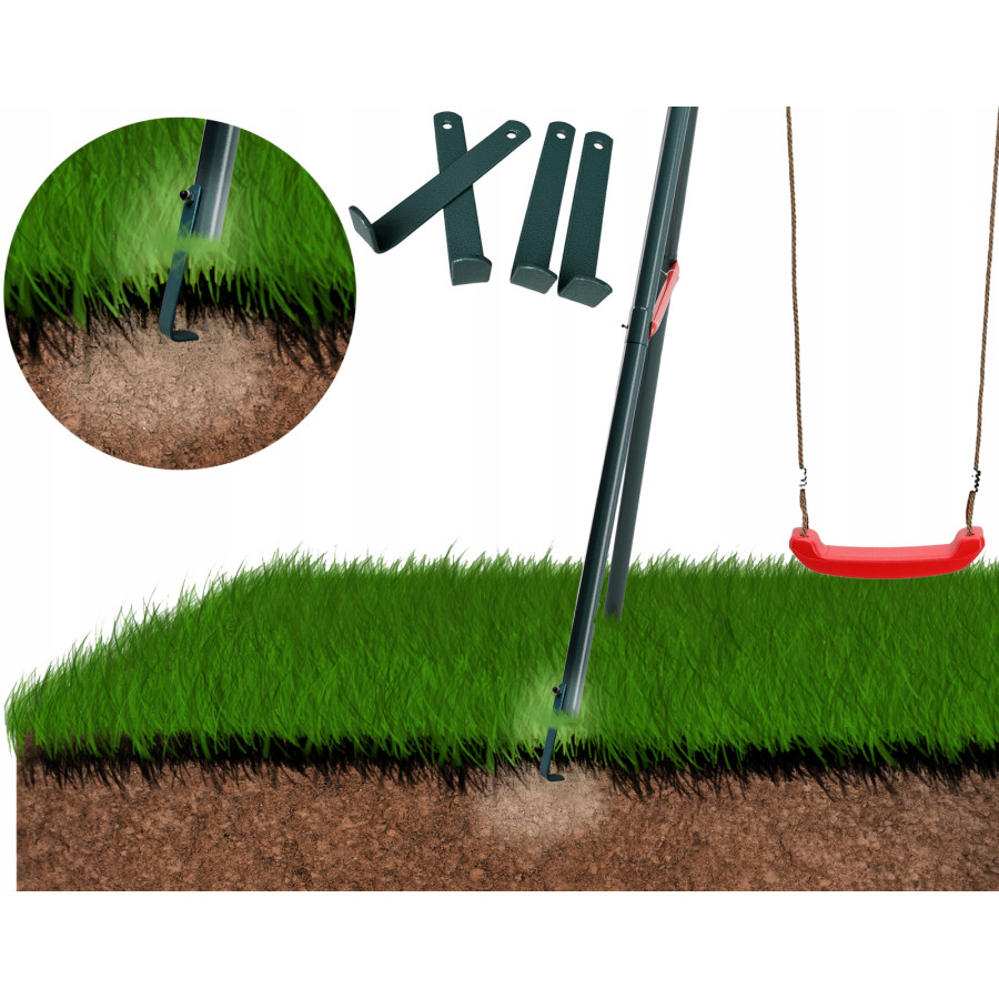 Acest leagăn exterior pentru copii este potrivit pentru grădină sau curte și susține până la 4 utilizatori în același timp. Este o alegere practică pentru familiile care își doresc un echipament sigur, stabil și ușor de integrat într-un spațiu de joacă de acasă.