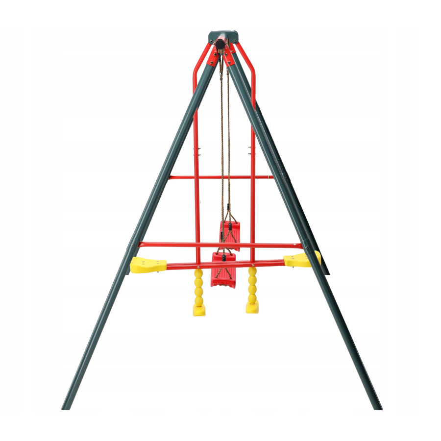 Transformă orice curte într-un spațiu de joacă plin de veselie cu acest leagăn de grădină dublu, conceput pentru distracție în aer liber. Setul include 2 scaune de leagăn și o hântă de echilibru, fiind ideal pentru mai mulți copii care vor să se joace simultan. Cadrul metalic vopsit electrostatic oferă rezistență bună la utilizarea exterioară, iar culorile vii îl fac atractiv pentru cei mici.
