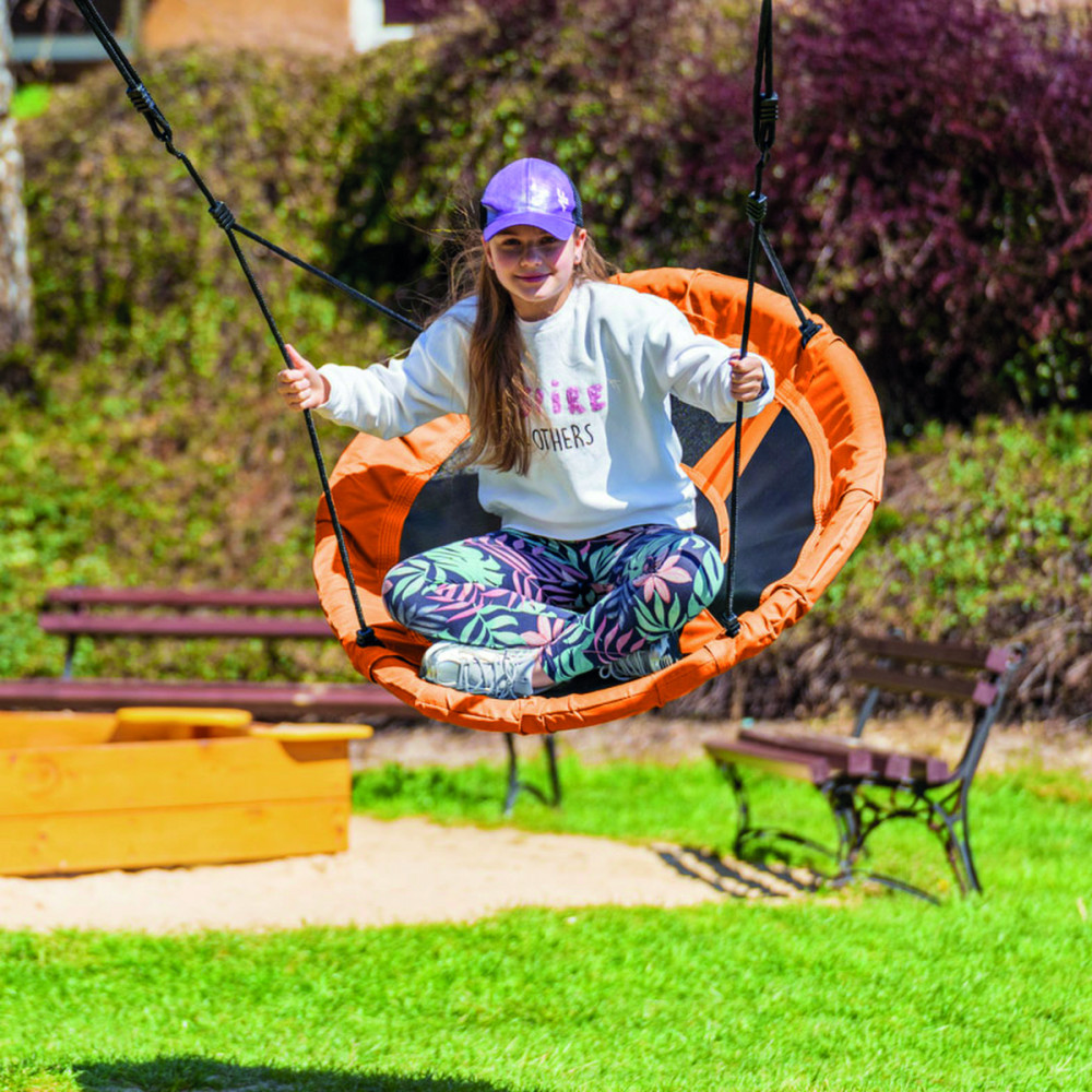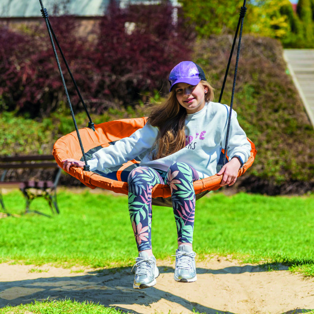 Bucurați-vă de joacă în aer liber cu leagănul pentru copii tip cuib de barză Mirpol, ideal pentru grădină, terasă sau curte. Scaunul rotund, cu diametru generos, oferă confort, iar construcția cu protecție din spumă ajută la reducerea loviturilor în timpul balansului.