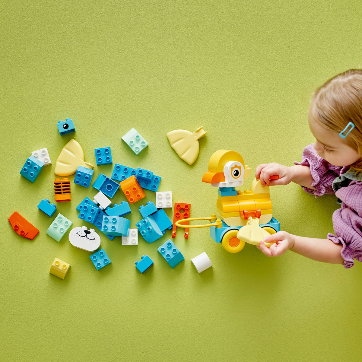 Stimulează creativitatea copiilor mici cu jucăria de construcţie Animale pe roţi 3 în 1 (10448). Micii iubitori de animale vor descoperi nenumărate modalităţi de a se bucura de joaca fantezistă construind răţuşca, peştele sau câinele sau chiar creând animale complet noi. Preşcolarii care adoră vehiculele de jucărie LEGODUPLOconstruiesc figurinele pe o bază cu roţi şi se distrează să-şi pună animalele în mişcare prin împingere sau prin tragere de un mâner.