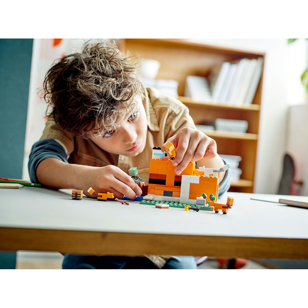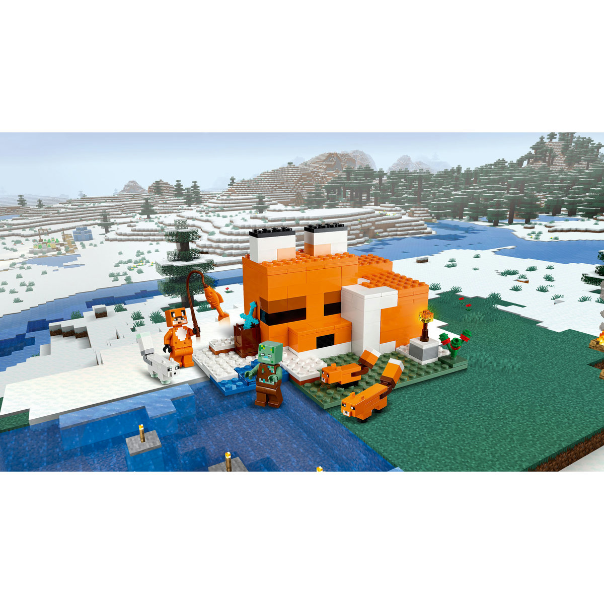 Foloseşte-ţi abilităţile Minecraft® pentru a crea o casă uriaşă a vulpilor. Partea din spate deschisă şi acoperişul ce poate fi ridicat uşurează aranjarea mobilierului şi permite distracţia din plin în interior. Afară ai un pui de vulpe, o vulpe adultă şi o vulpe arctică pe care îi hrăneşti cu fructe de pădure dulci înainte de a-i duce la culcare. În sfârşit, e vremea să pescuim. Atenţie! Un înecat se îndreaptă spre tine! Ia-ţi sabia pentru a respinge atacurile zombi.