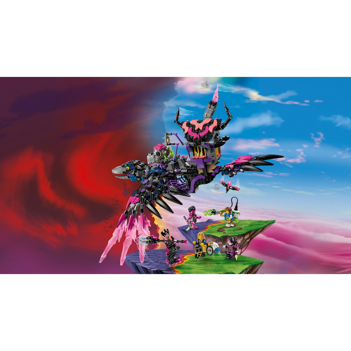 Micii visători se vor distra construind ticălosul corb al Vrăjitoarei din Never, pentru ca apoi să-l transforme într-o colibă-corb sau într-o colecţie de 3 creaturi de coşmar: o casă mergătoare, un păianjen-cazan şi un corb uriaş! Casa de jucărie are un acoperiş şi o uşă care se deschid, păianjenul are o cuşcă şi picioare mobile, iar corbul are aripi şi pene articulate.