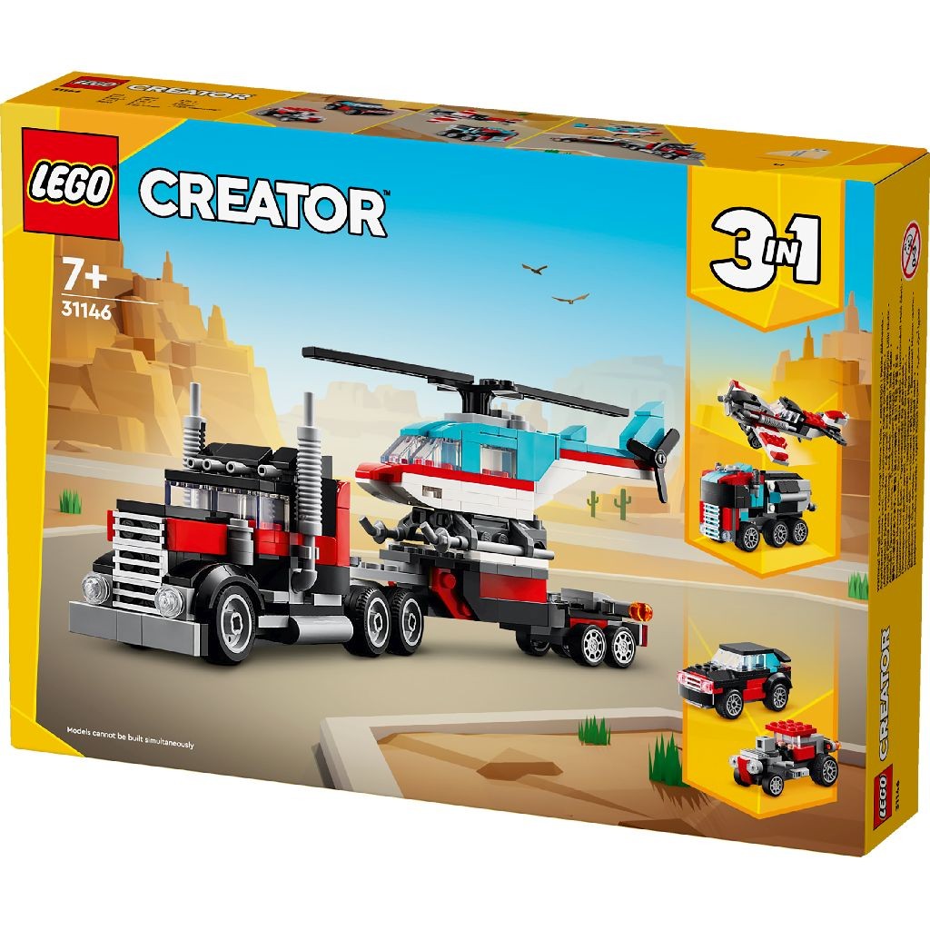 Aventuri de mare viteza ii asteapta pe baietii si pe fetele in varsta de 7+ ani cu setul LEGO Creator Camioneta cu platforma si elicopter (31146). Pot folosi cele 270 de piese din acest set 3in1 pentru a construi un camion cu platforma de jucarie cu roti mobile, care poate sa transporte un elicopter LEGO cu elice mobile in remorca.Copiii pot construi 3 seturi diferite cu vehicule ce contin doua vehicule separate cu aceasta jucarie LEGO Creator 3in1. Au ocazia de a construi Camioneta cu platforma si elicopter, sa le reconstruiasca sub forma unui avion cu elice si unui camion cu rezervor de combustibil cu roti mobile, sa asambleze o masina hot rod si un SUV pentru curse, sau sa foloseasca caramizile pentru a crea propriile vehicule.