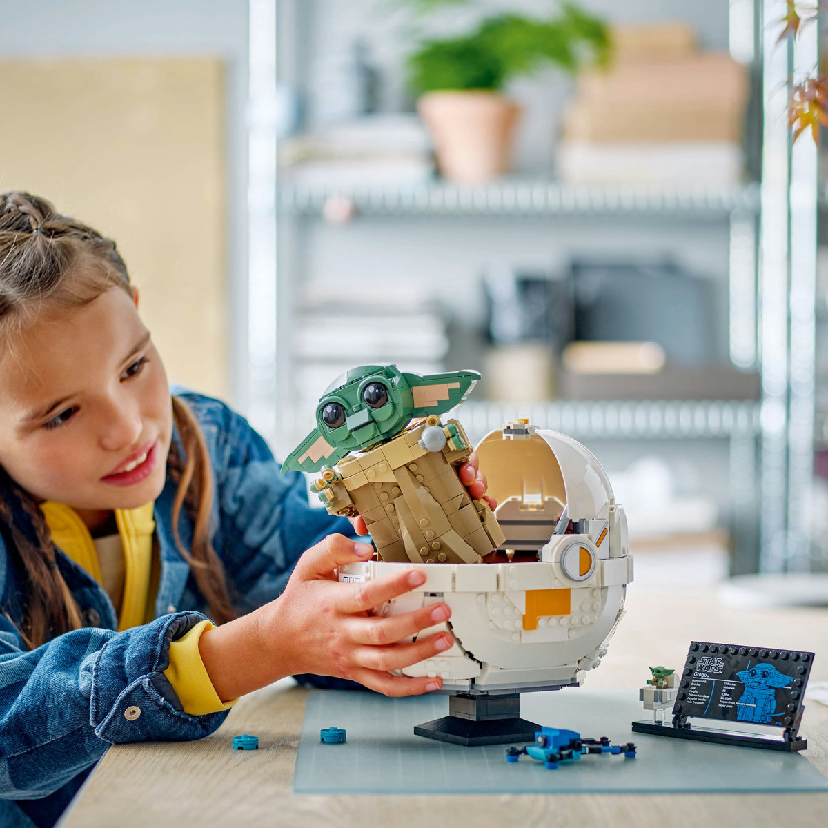 Modelul principal din acest set de construcţie şi de colecţie Star Wars este însoţit de o figurină LEGO Grogu de dimensiuni standard într-un mic landou planor construibil, precum şi de o plăcuţă cu informaţii care completează exponatul vesel.