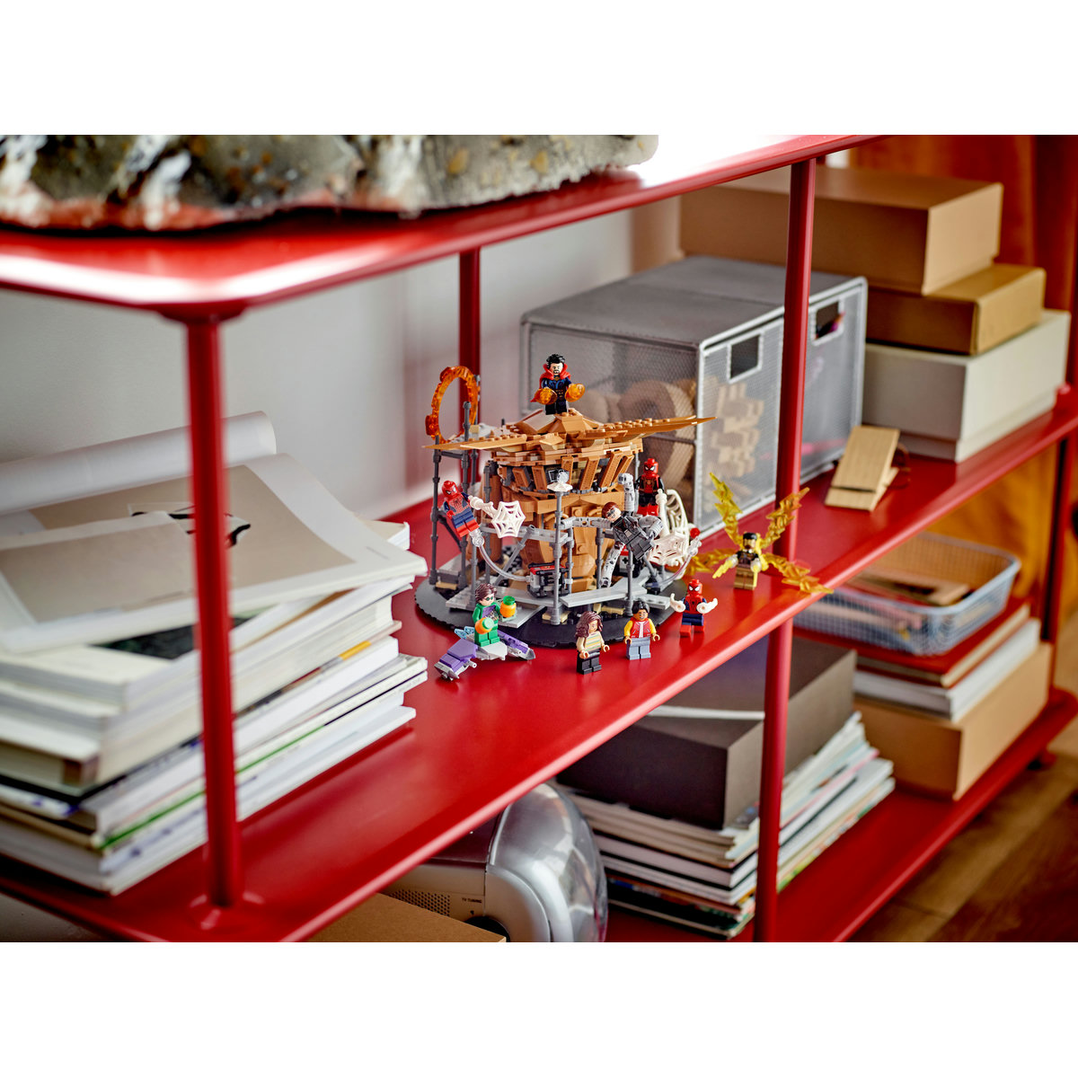 Acest set de 360 de grade include o varietate uimitoare de minifigurine LEGO Marvel, între care 3 versiuni ale Omului Păianjen: Friendly Neighborhood Spider-Man (Tobey Maguire), Uimitorul Om Păianjen (Andrew Garfield) şi Omul-Păianjen (Tom Holland). Celelalte minifigurine sunt Electro, Doctor Strange, Green Goblin, Ned, MJ şi Doc Ock. Setul conţine numeroase dotări pentru a oferi cât mai multe posibilităţi de joacă şi etalare, între care 3 suporturi de minifigurine pentru acţiune în aer, un acoperiş detaşabil care dezvăluie mâna lui Sandman, o zonă de acces prin spate către un portal şi un element pânză moale care înfăşoară minifigurinele. Pentru mai multă distracţie digitală, constructorii pot apropia, roti seturile în 3D şi-şi pot monitoriza progresul folosind aplicaţia distractivă şi intuitivă LEGO Builder.