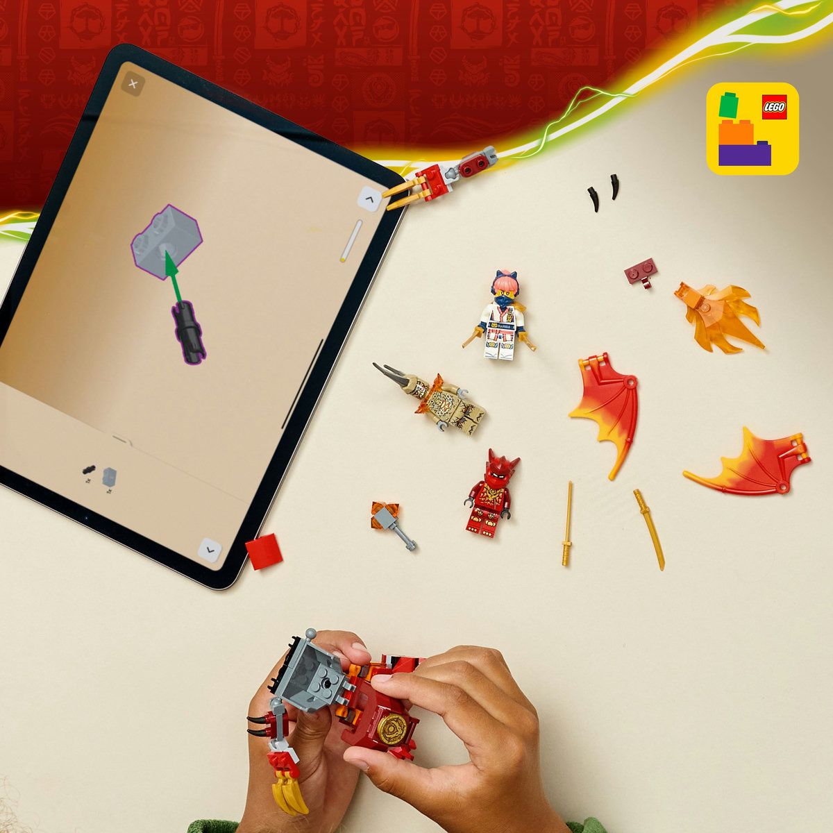 Baietii, fetele si fanii de 6 ani si mai mari ai serialului TV NINJAGO Ascensiunea dragonilor se vor bucura de ore intregi de joaca fantezista cu setul de constructie LEGO NINJAGO Pachet de lupta cu robotul dragon al lui Kai (71851). Acest set contine un robot dragon cu picioare, aripi mari, maini articulate cu aspect de gheare si un trunchi care se roteste la 360 de grade, plus un cockpit in care sa fie asezata o minifigurina. Aceasta jucarie ninja accesibila include 3 minifigurine Kai cu 2 accesorii sabie, Sora cu 2 sabii si un Monstru de pamant cu maini cu aspect de gheare, astfel incat copiii sa se bucure de ore intregi de aventuri in care interpreteaza scena din sezonul 4 al serialului NINJAGO Ascensiunea dragonilor. Gama LEGO NINJAGO de seturi de constructie si jucarii de aventuri pentru copii include roboti, dragoni si temple detalii, astfel incat fanii sa poata interpreta pe roluri scene de actiune ninja impresionante. Copiii pot construi cu incredere fiecare set aplicatia LEGO Builder, apropiind, rotind in 3D si urmarindu-si progresul cu instructiuni usor de urmat. Setul contine 85 de piese.