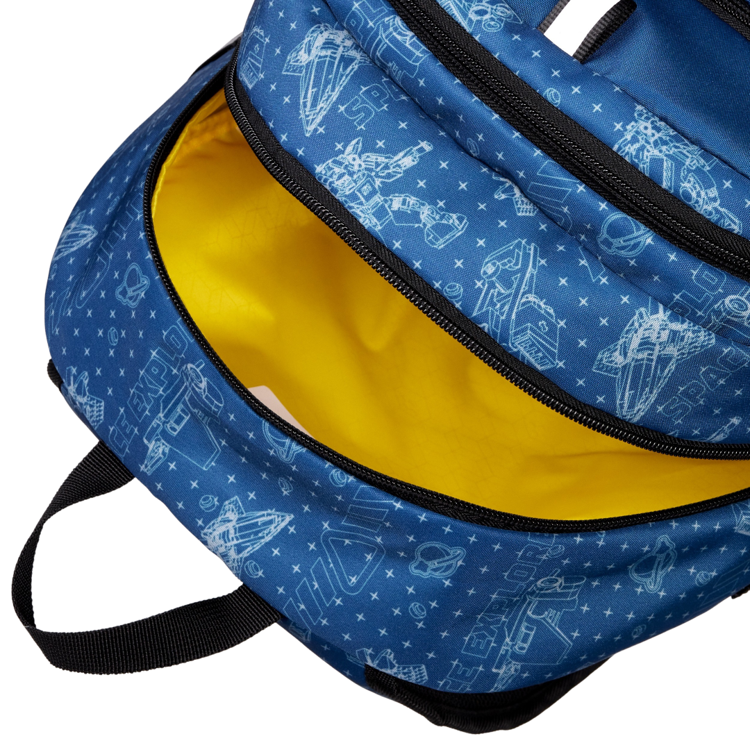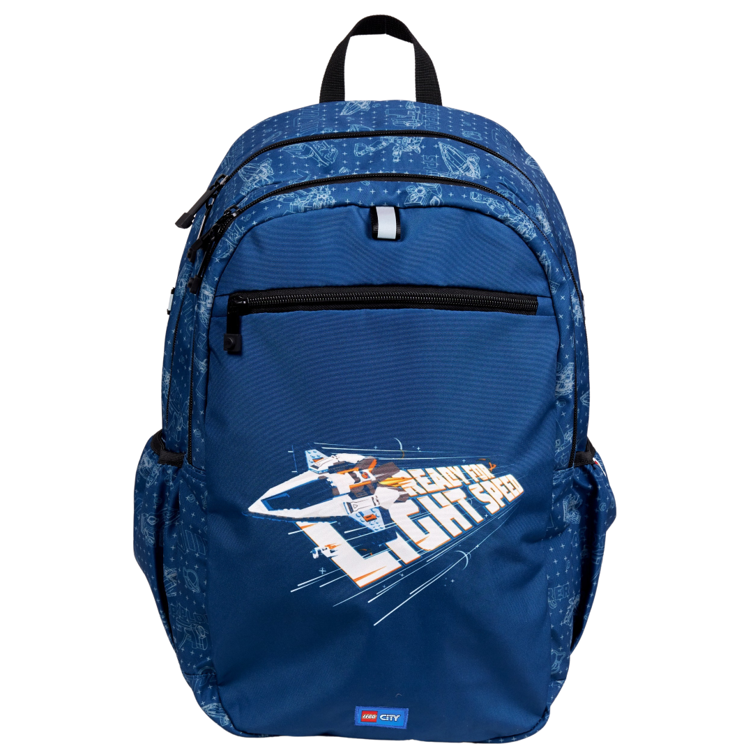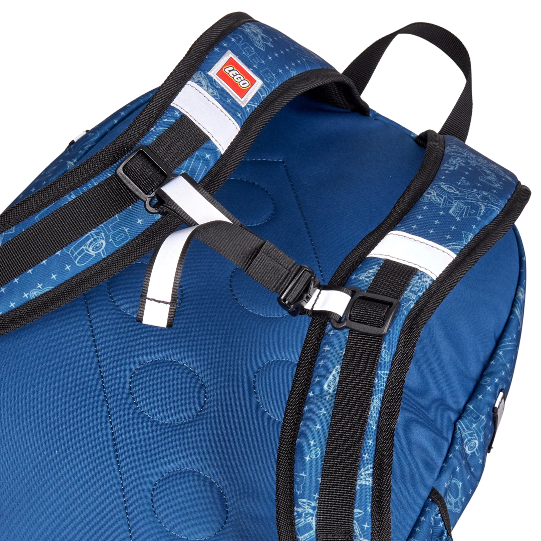 Rucsacul dispune de 2 compartimente principale, un buzunar frontal mic cu fermoar pentru obiecte de valoare ţi 2 buzunare laterale din plasă, ideale pentru sticle de apă sau alte lucruri mărunte. Panoul din spate este căptuţit ţi respirabil, decorat cu un model inspirat de cărămizile LEGO. Bretelele sunt reglabile ţi căptuţite, iar elementele reflectorizante pe toate cele patru laturi asigură o vizibilitate sporită.
