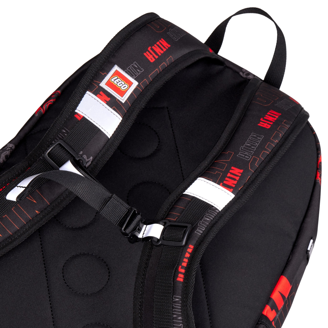 Rucsacul dispune de 2 compartimente principale, un buzunar frontal mic cu fermoar pentru obiecte de valoare ţi 2 buzunare laterale din plasă, ideale pentru sticle de apă sau alte lucruri mărunte. Panoul din spate este căptuţit ţi respirabil, decorat cu un model inspirat de cărămizile LEGO. Bretelele sunt reglabile ţi căptuţite, iar elementele reflectorizante pe toate cele patru laturi asigură o vizibilitate sporită.